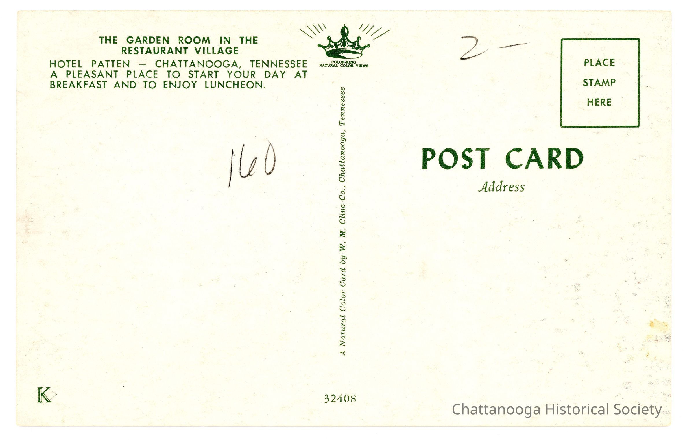 Postcard showing the interior of The Garden Room inside of the "restaurant village" in the Hotel Patten. The view shows midcentury dining room and mural on the back wall. The information blurb on the rear reads "THE GARDEN ROOM IN THE | RESTAURANT VILLAGE | Hotel Patten - Chattanooga, Tennessee | A Pleasant Place to Start Your Day At Breakfast And To Enjoy Luncheon." The postcard is a "Color-King Natural Color Card"Subject Person/Organization