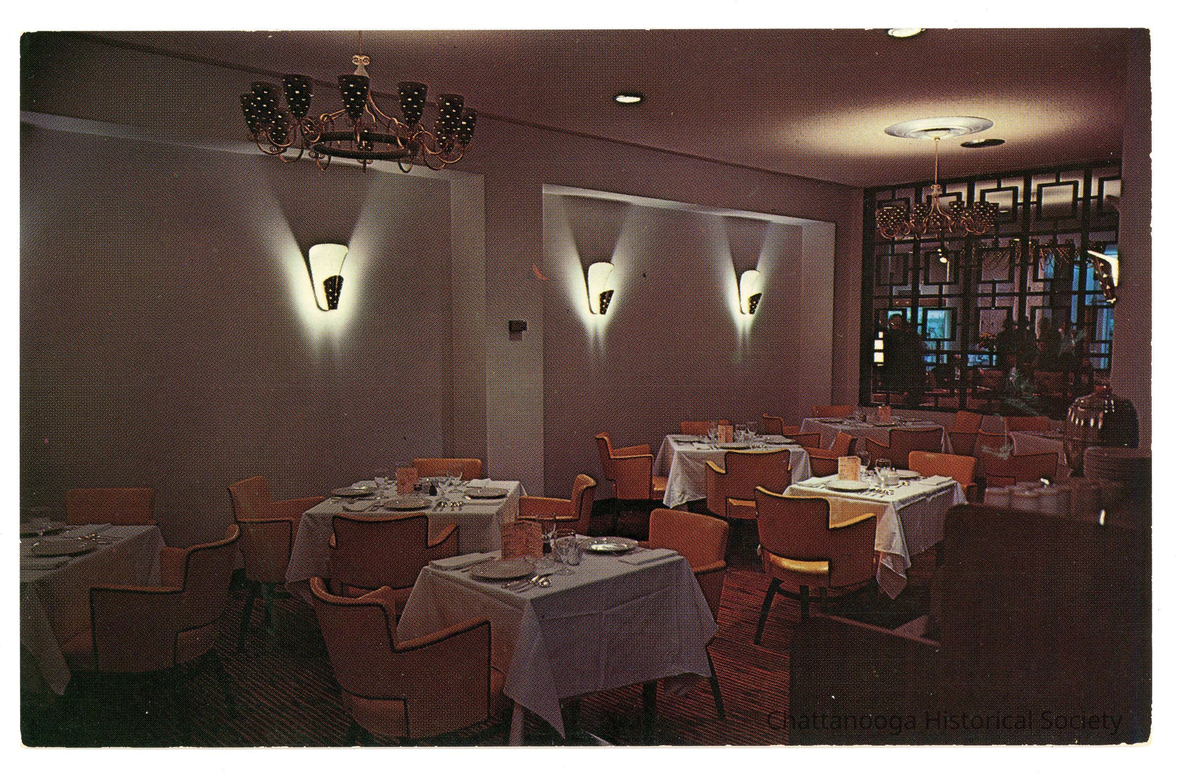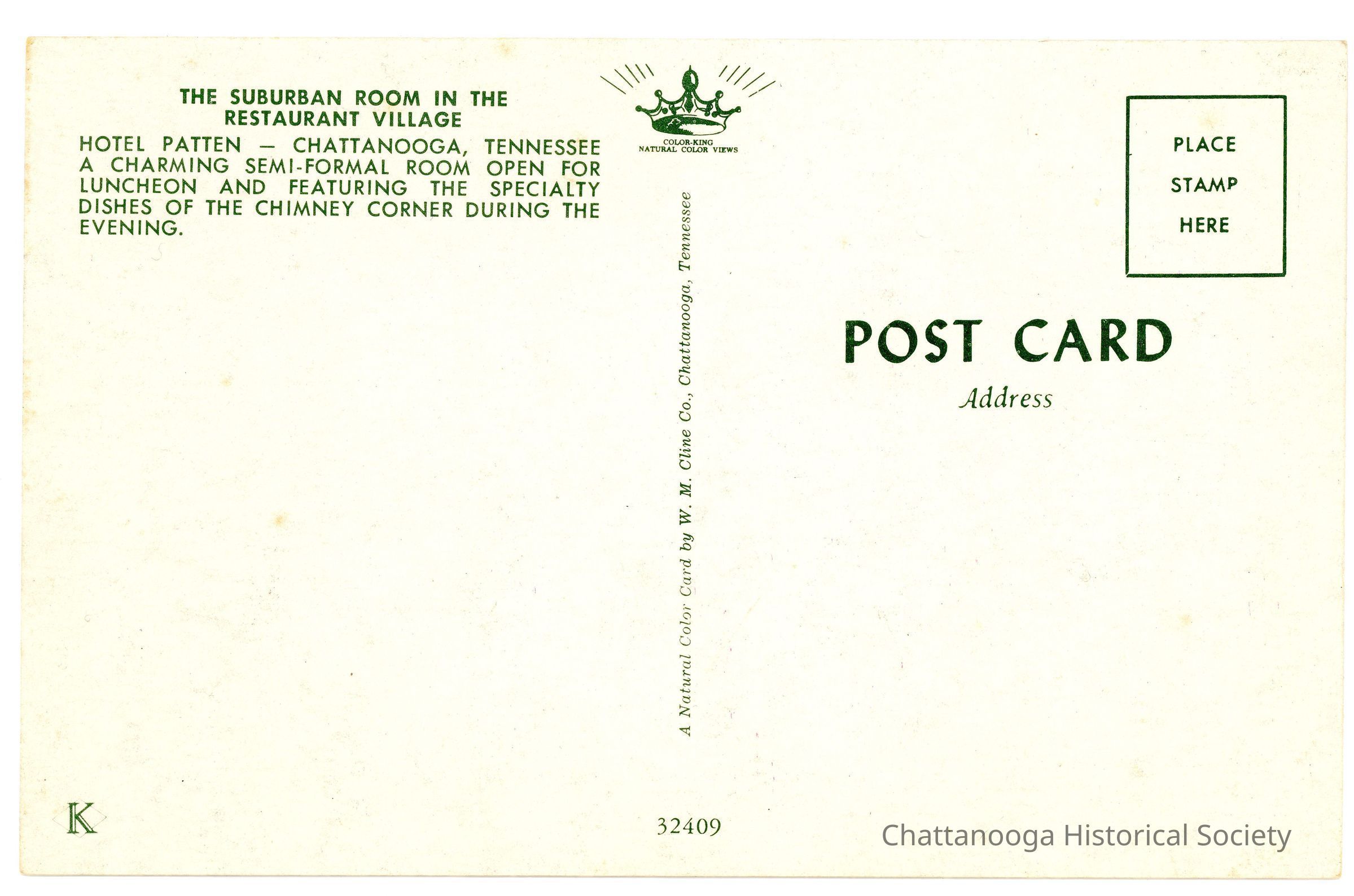 Color postcard showing the interior dining room of The Suburban Room in the "restaurant village" at the Hotel Patten. The information on the verso reads "THE SUBURBAN ROOM IN THE | RESTAURANT VILLAGE | Hotel Patten - Chattanooga, Tennessee | A Charming Semi-Formal Room Open For | Luncheon and Featuring The Specialty | Dishes Of The Chimney Corner During The Evening" The postcard is a Color-King Natural Color Card.Subject Person/Organization