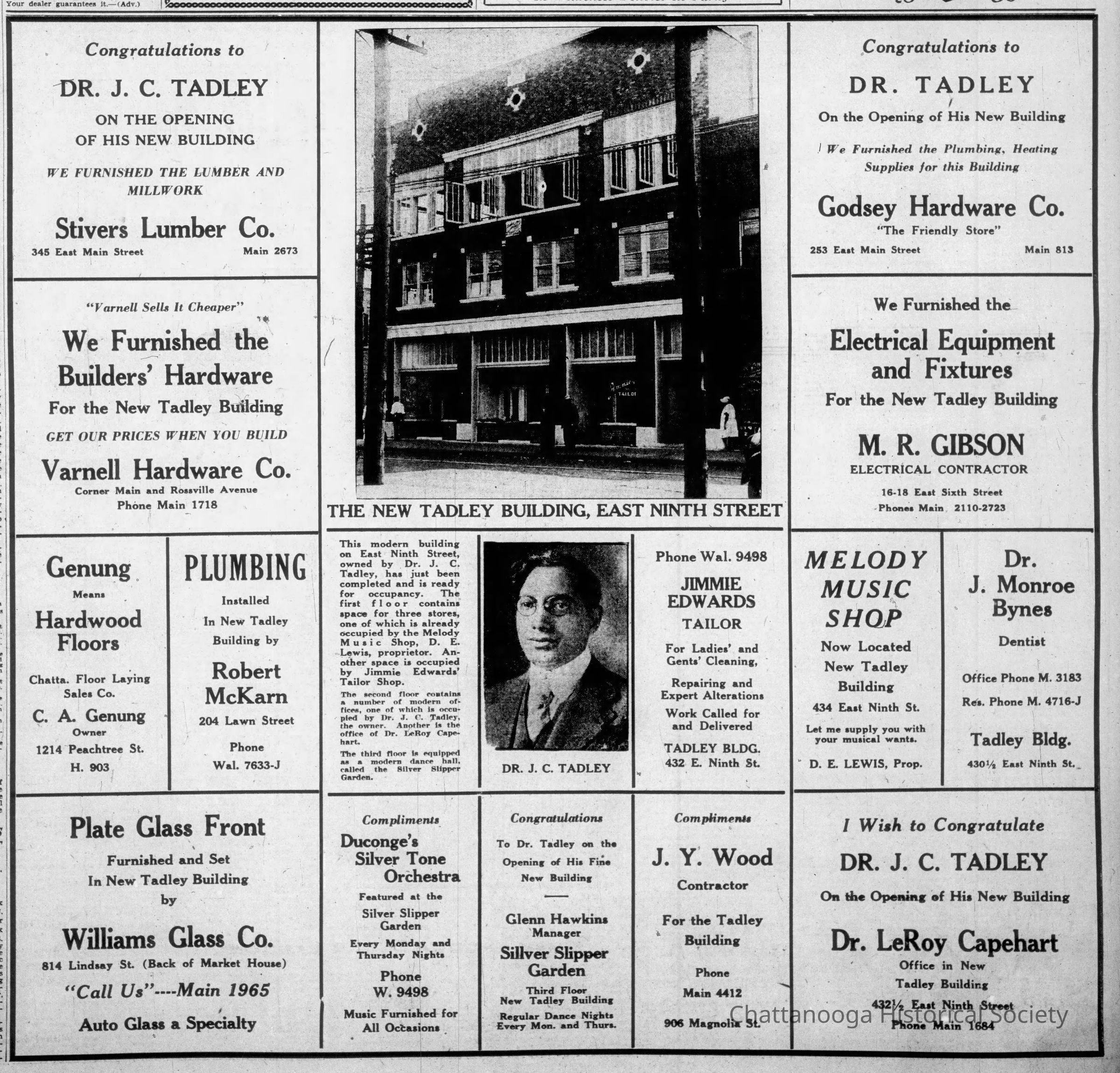 An advertisement in the Chattanooga Times when the Tadley Building opened shows the many people who contributed to the construction: