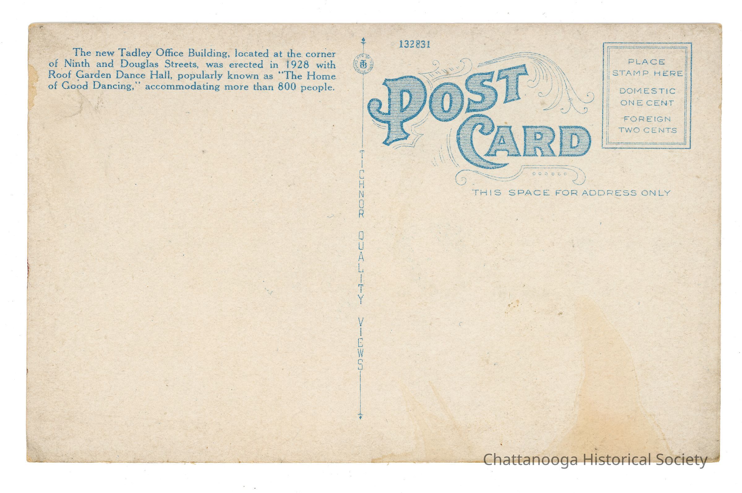 A inset image in an oval frame shows the interior of the dance hall, lined with chairs. On the verso, the postcard reads "The new Tadley Office Building, located at the corner of Ninth and Douglas Streets, was erected in 1928 with Roof Garden Dance Hall, popularly known as "The Home of Good Dancing," accommodating more than 800 people." The dividing line has the Tichnor Brothers logo at the top, with "Tichnor Quality Views" below. On the top right, the postcard is numbered 132831 with a decorative font reading "Post Card". The stamp box reads "Place | Stamp Here | Domestic | One Cent | Foreign | Two Cents"