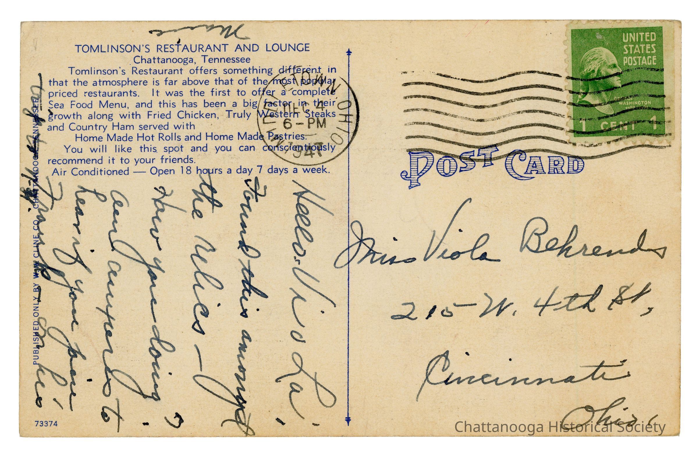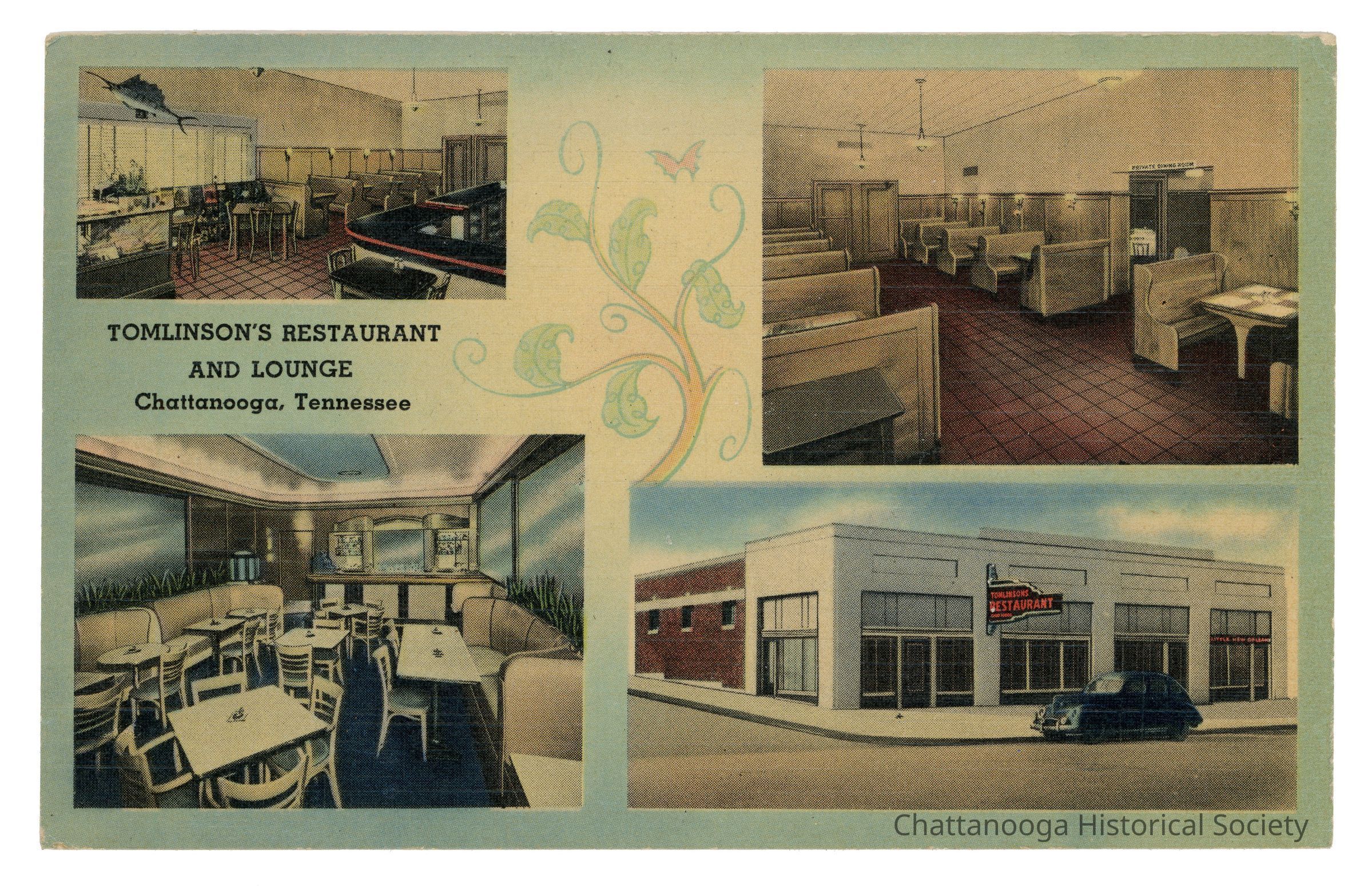 The information on the rear reads "Tomlinson's Restaurant and Lounge | Chattanooga, Tennessee | Tomlinson's Restaurant offers something different in | that the atmosphere is far above that of the most popular | Sea Food Menu, and this has been a big factor in their | growth along with Fried Chicken, Truly Western Steaks, | and Country Sam served with | Home Made Hot Rolls and Home Made Pastries. | You will like this spot and you can conscientiously | recommend it to your friends. | Air Conditioned - Open 18 hours a day 7 days a week."Subject Person/Organization