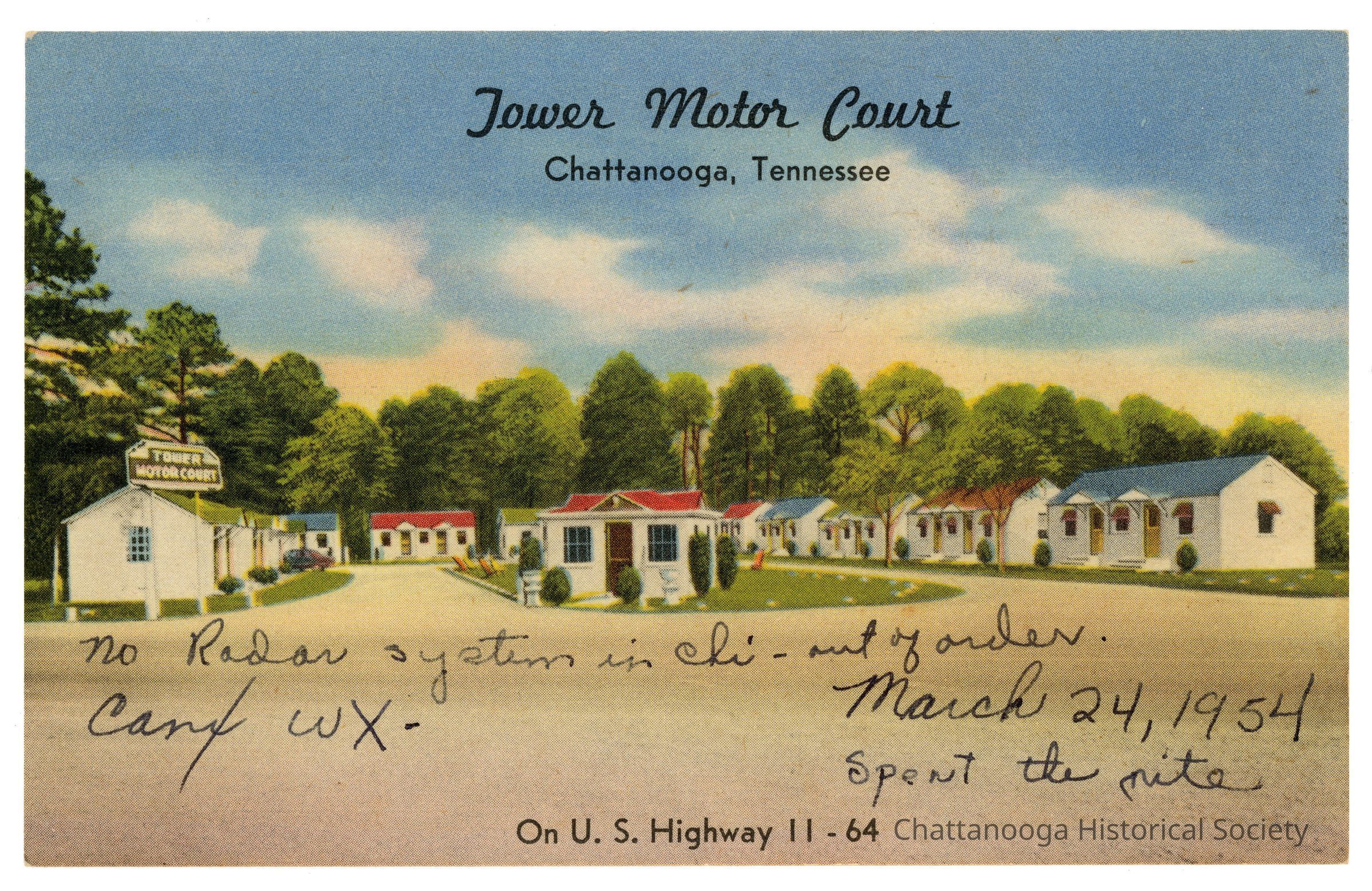 Linen postcard advertising for the Tower Motor Court. The view shows a U-shaped drive with small two room cabins flanking it and a smaller office in the center of the U in a green space. A road sign at left reads "Tower | Motor Court". The postcard has the label "Tower Motor Court | Chattanooga, Tennessee" at top and "On U.S. Highway 11-64" along the bottom edge. Handwritten on the front, underneath the hotel's illustration is "no Radar system in chi- out of order. | MArch 24, 1954 | Spent the nite".