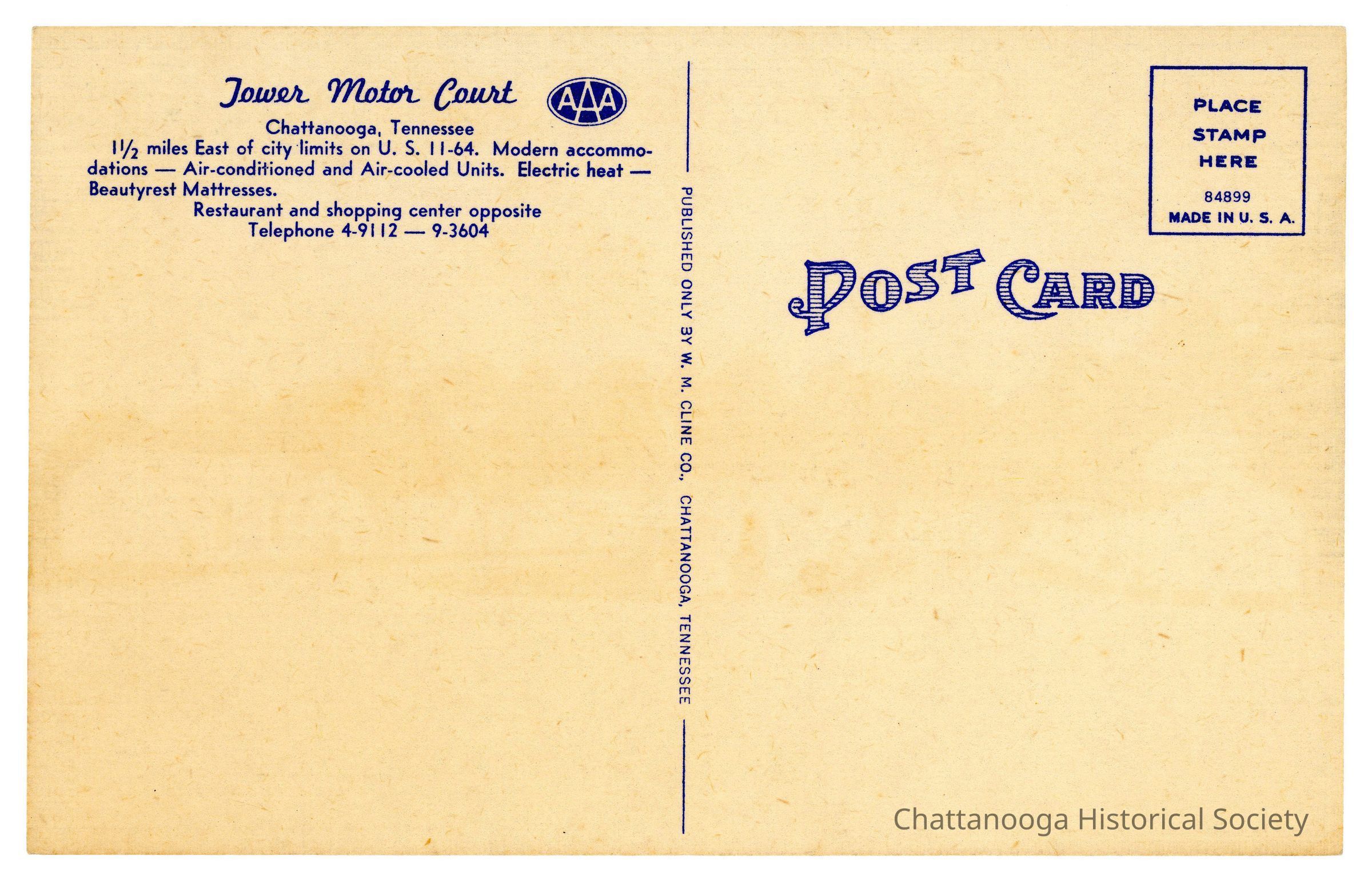 The information blurb on the rear reads "Tower Motor Court | Chattanooga, Tennessee | 1 1/2 miles East of city limits on U.S. 11-64. Modern accommo- | dations - Air - conditioned and Air-cooled Units. Electric heat - | Beautyrest Mattresses | Restaurant and shopping center opposite | Telephone 4-9112 - 9-3604" with a "AAA" logo beside it.Subject Person/Organization