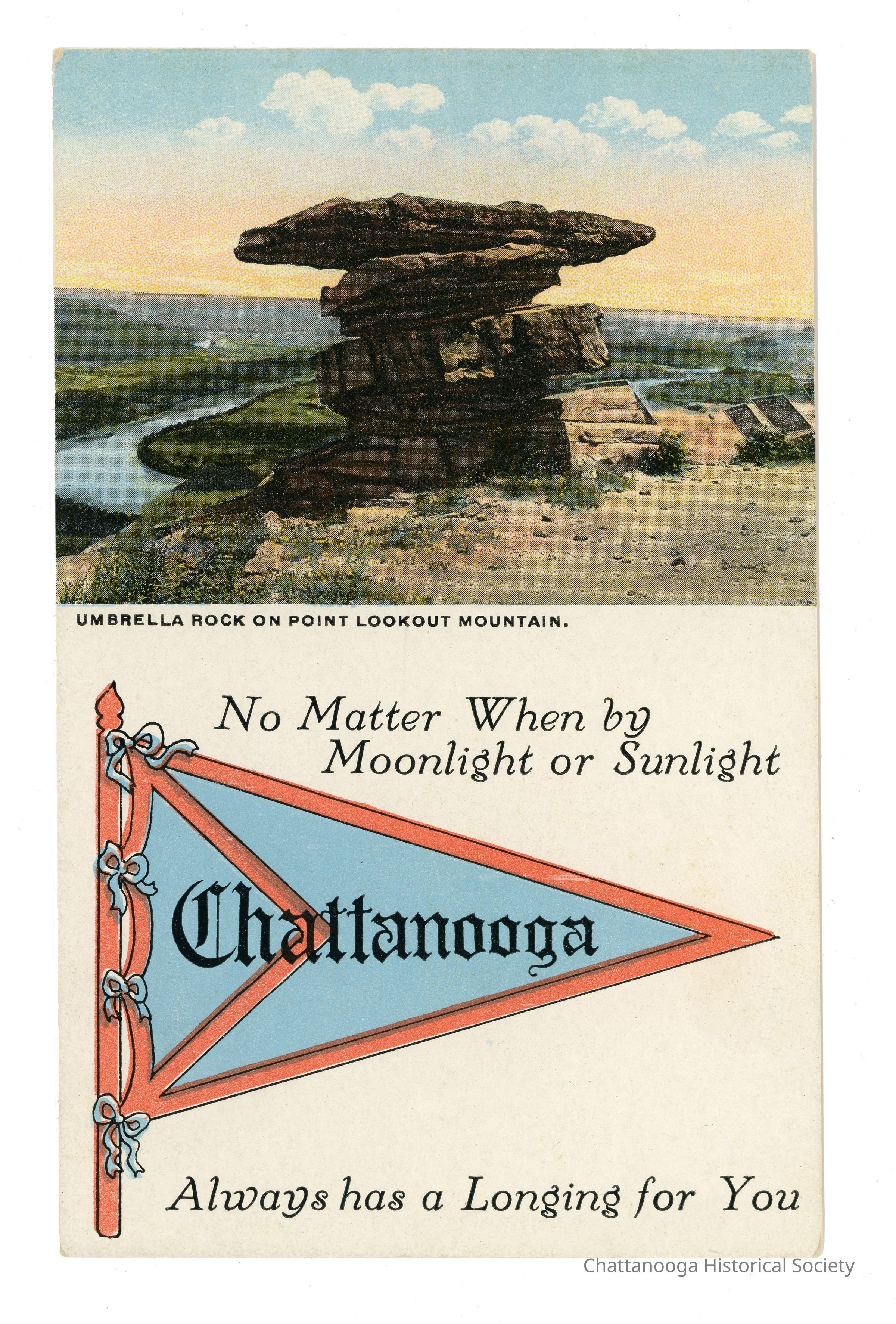 A halftone postcard of Umbrella Rock on Lookout Mountain with Chattanooga pennant. The top half of the postcard features an image of Umbrella Rock with the Tennessee River in the background. Underneath the image of the rock formation is the title "Umbrella Rock on Point Lookout Mountain"