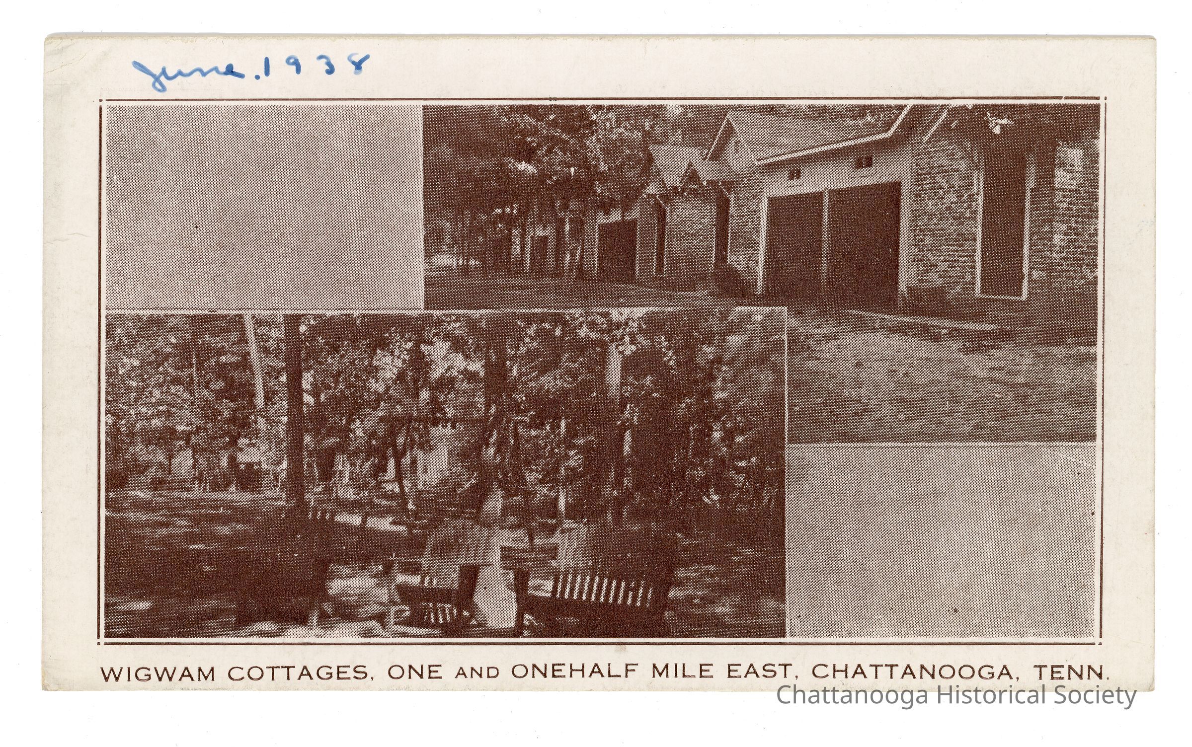 A postcard for the Wigwam Cottages, a hotel on Lee Highway in Chattanooga, Tennessee. The postcard features two inset photographs, one showing the brick cottages at the top and a lower photograph showing the outdoor space. The brown toned postcard is titled "Wigwam Cottages, One and Onehalf Mile East, Chattanooga, Tenn." and June 1938 is written in blue ink at the top left in the postcard gutter.