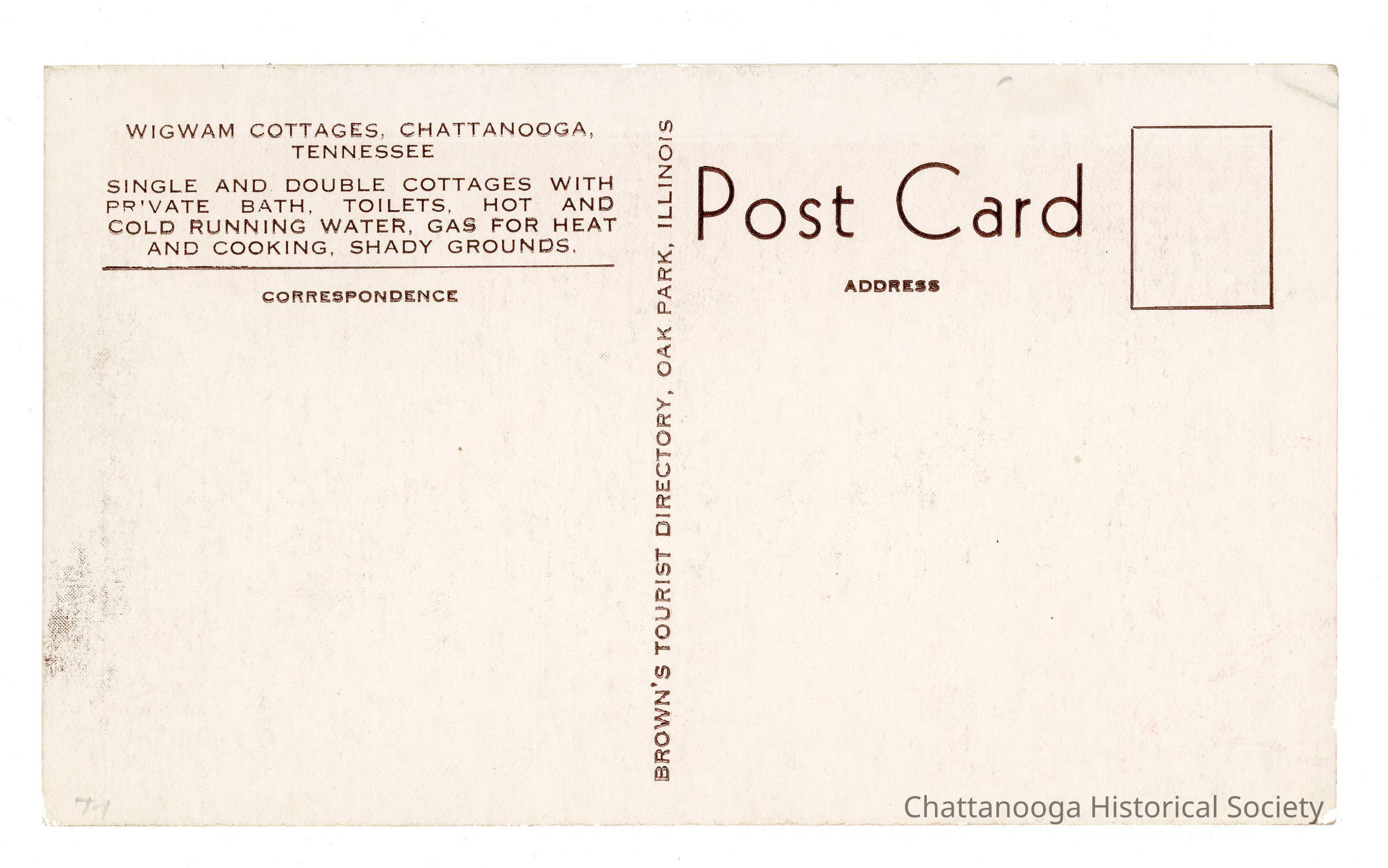 The advertising message on the rear reads "Wigwam Cottages, Chattanooga Tennessee | Single and Double Cottages with Private Bath, Toilets, Hot and Cold Running Water, Gas for Heat and Cooking, Shady Grounds"Subject Person/Organization
