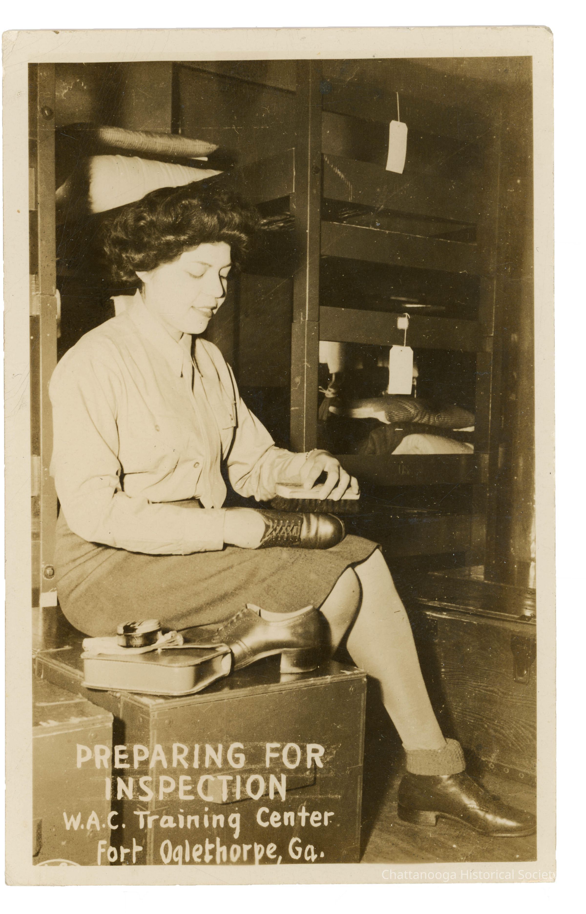 Real photo postcard of a WAC preparing for inspection. The photograph mounted on postcard paper, shoes a young woman shining a leather shoe. She is wearing a Women's Army Corp uniform of a skirt, button up shirt and tie. The woman is sitting on a wooden storage box with the shoe she is shining on her lap. The other shoe as well as the shoe wax container and purse are on the top of the box. A set of bunkbeds can be seen behind her, with a folded bunk roll. "Preparing for Inspection W.A.C. Training Center Fort Oglethorpe, Ga." is written on the bottom, left.Subject Person/Organization
