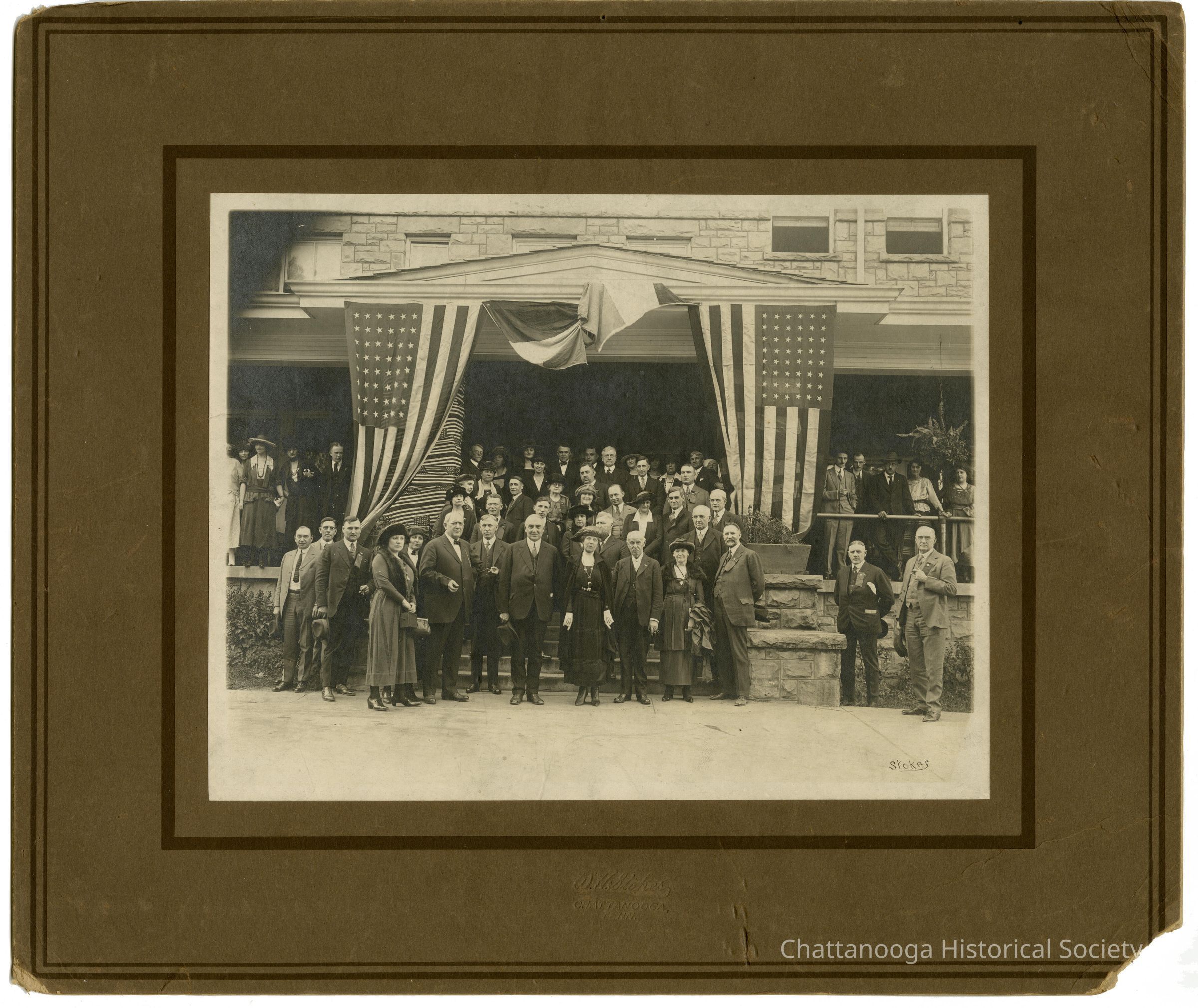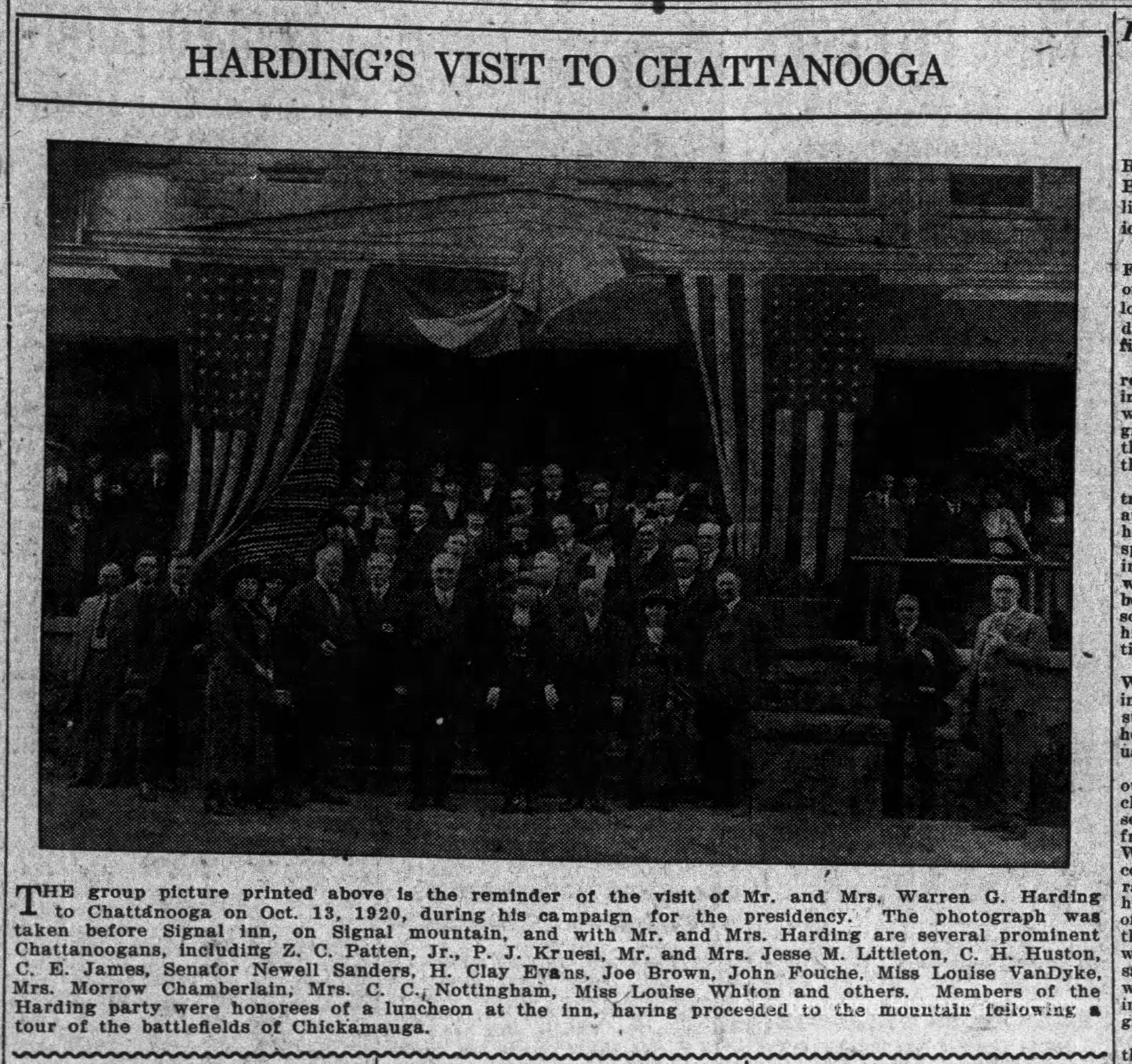 A black and white photograph of President Warren G. Harding standing with a large group of people in front of the Signal Mountain Inn on Signal Mountain, Tennessee during Harding's campaign for United States President 13 October 1920. Mr. Harding and his wife, Florence King Harding, are positioned at center with several prominent Chattanooga's. A Chattanooga Daily Times article that features this photograph mentions Z.C. Patten, Jr., P.J. Krusei, Mr. & Mrs. Jesse M. Littleton, C.H. Huston, C.E. James, Senator Newell Sanders, Henry Clay Evans, Joe Brown, John Fouche, Miss Louise VanDyke, Mrs. Morrow Chamberlain, Mrs. C.C. Nottingham, Miss Louise Whiton, among others. Harding was visiting the hotel for a luncheon honoring members of the President's party.