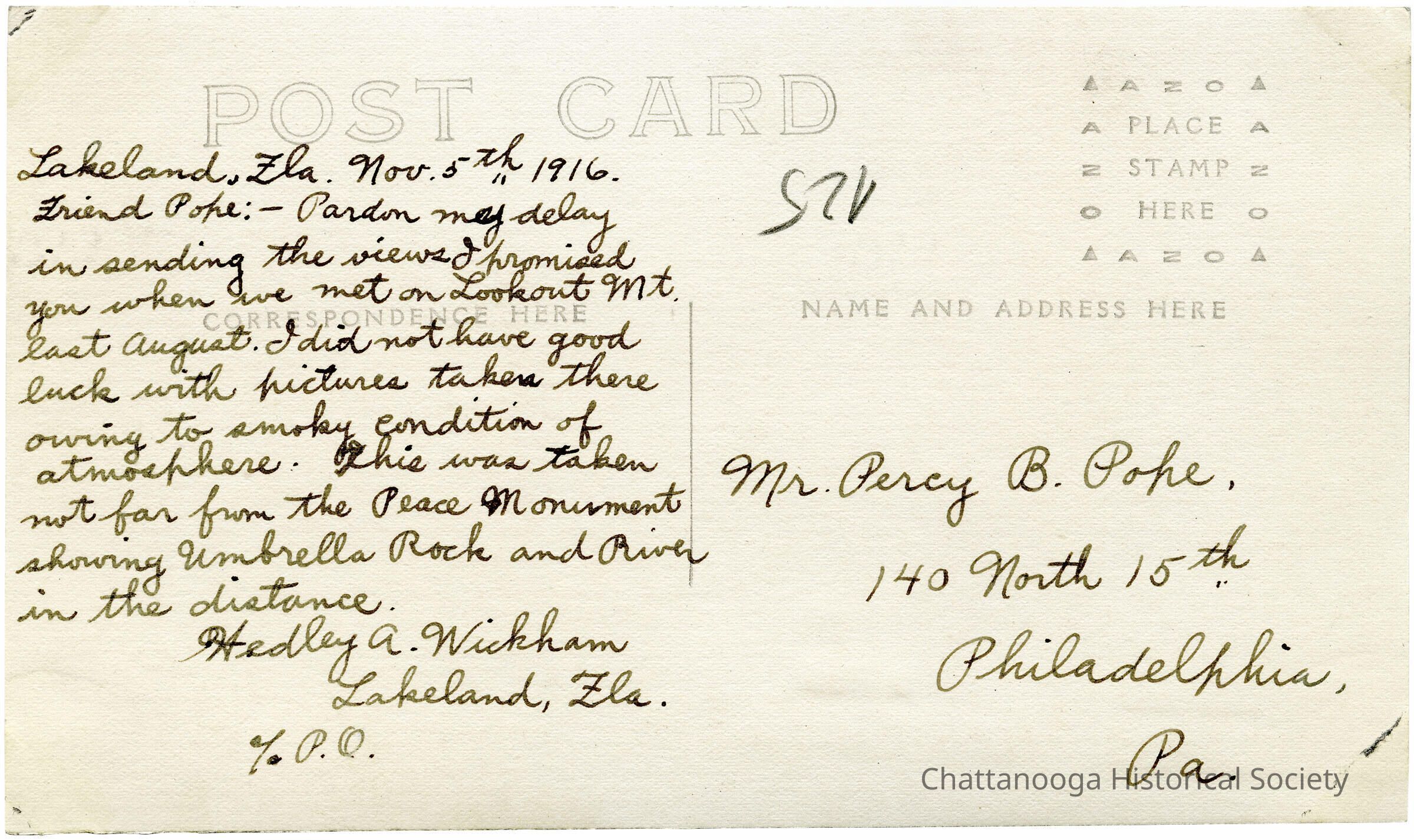 A gelatin-silver printed postcard with the front showing a unique perspective of Umbrella Rock and its surroundings, including a wooden box camera on its tripod positioned to take portraits of visitors to the rock. To the right is the side of Pulpit Rock. The sign below Umbrella Rock describes the Battle of Wauhatchie that took place in the valley below.
