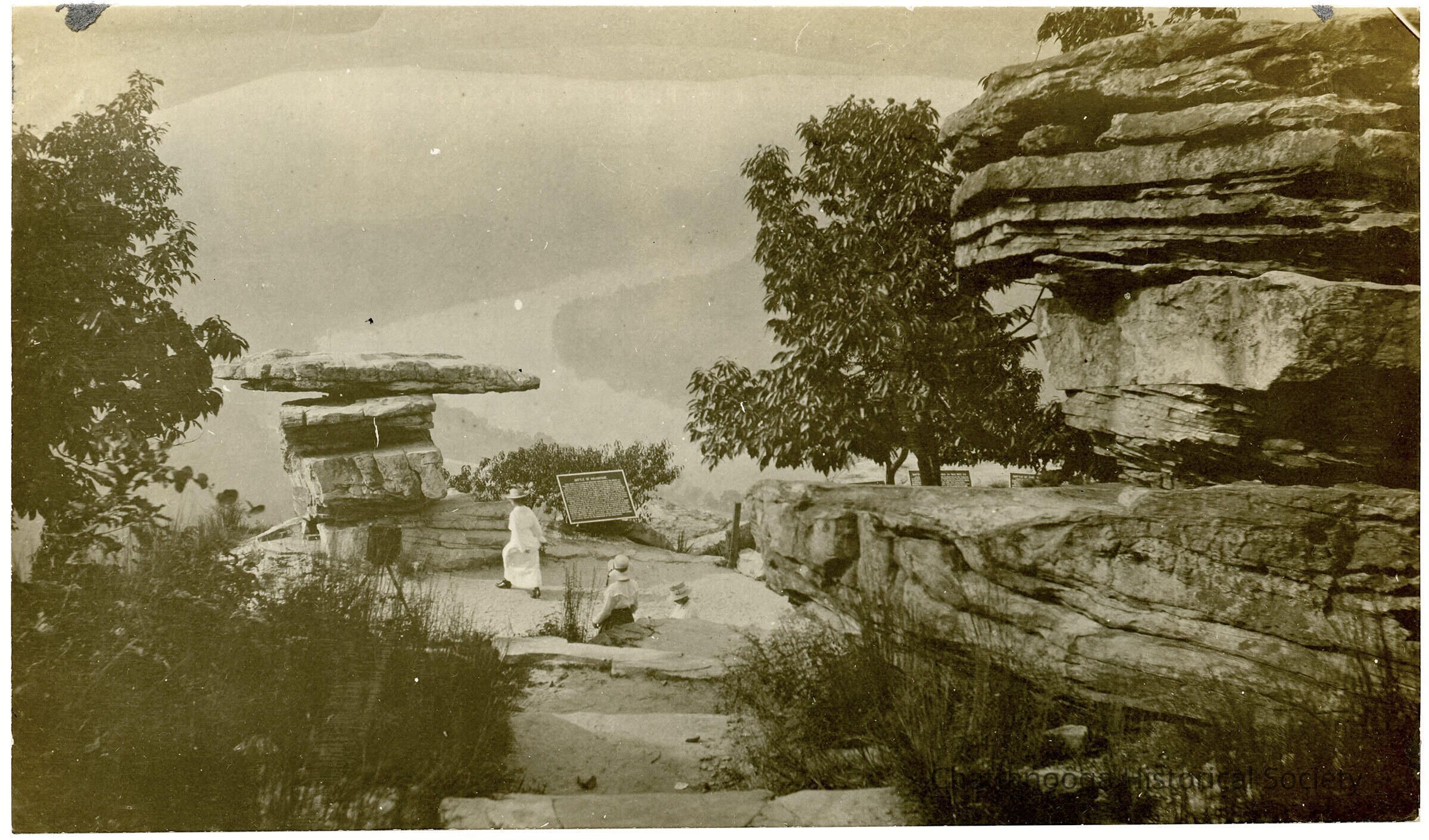 Perched atop Point Lookout, Umbrella Rock is one of the most famous locations in the Chattanooga area. This unusual geological formation consists of several large stones topped by a large, flat slab. The rock has hosted innumerable visitors over the years, perhaps most famously Ulysses S. Grant. Formerly a popular location for photographs, erosion has made it unstable, and it is now closed to the public.Subject Place