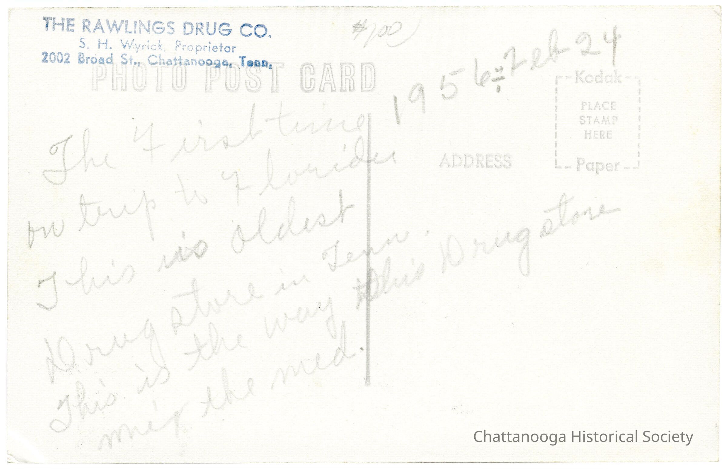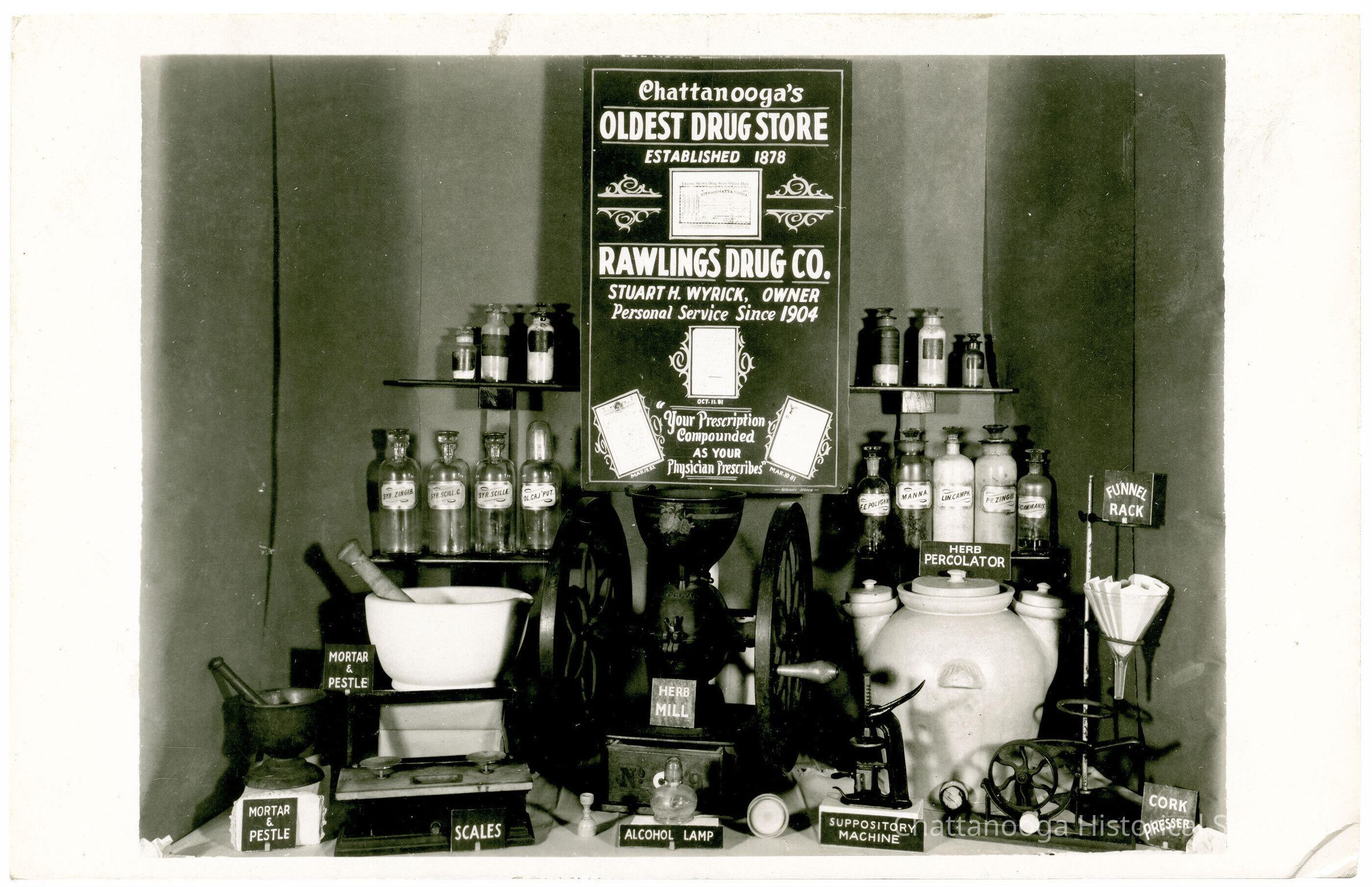 A sign in the center of the display reads "Chattanooga's oldest drug store, established 1878, Rawlings Drug Co., Stuart Wyrick, Owner, Personal Service Since 1904, Your Prescription As Your Physician Prescribes"