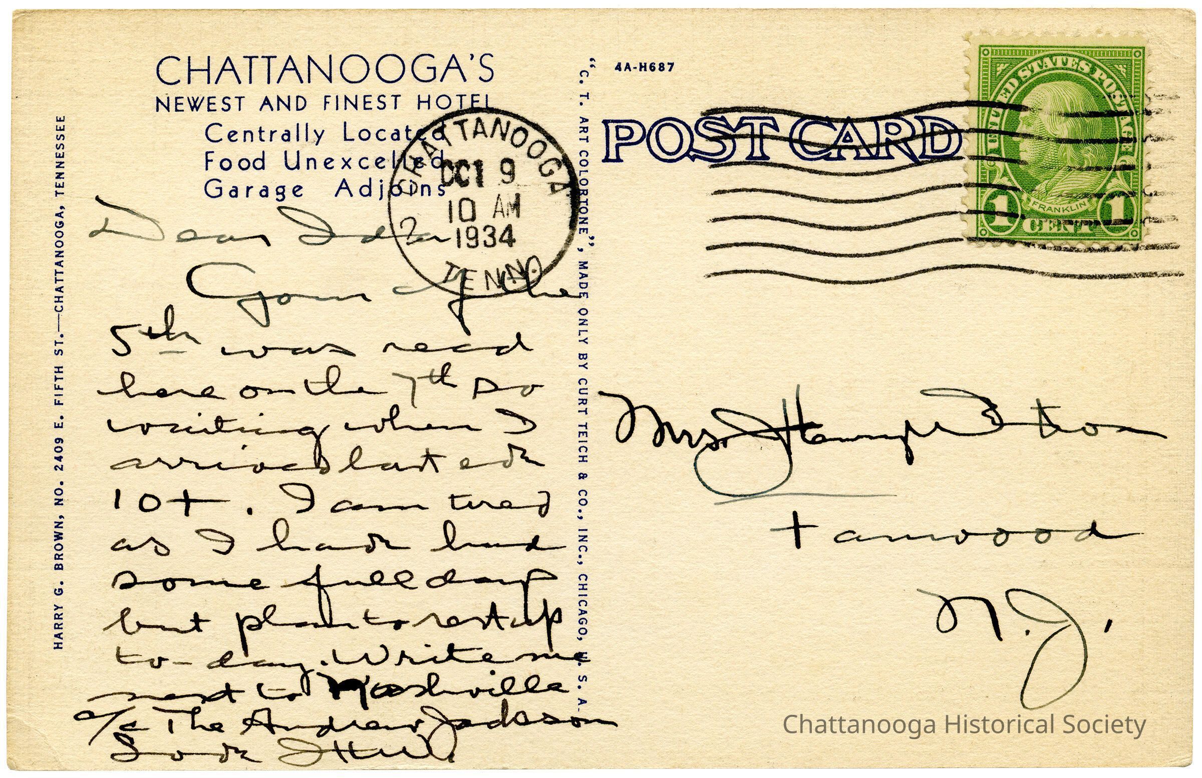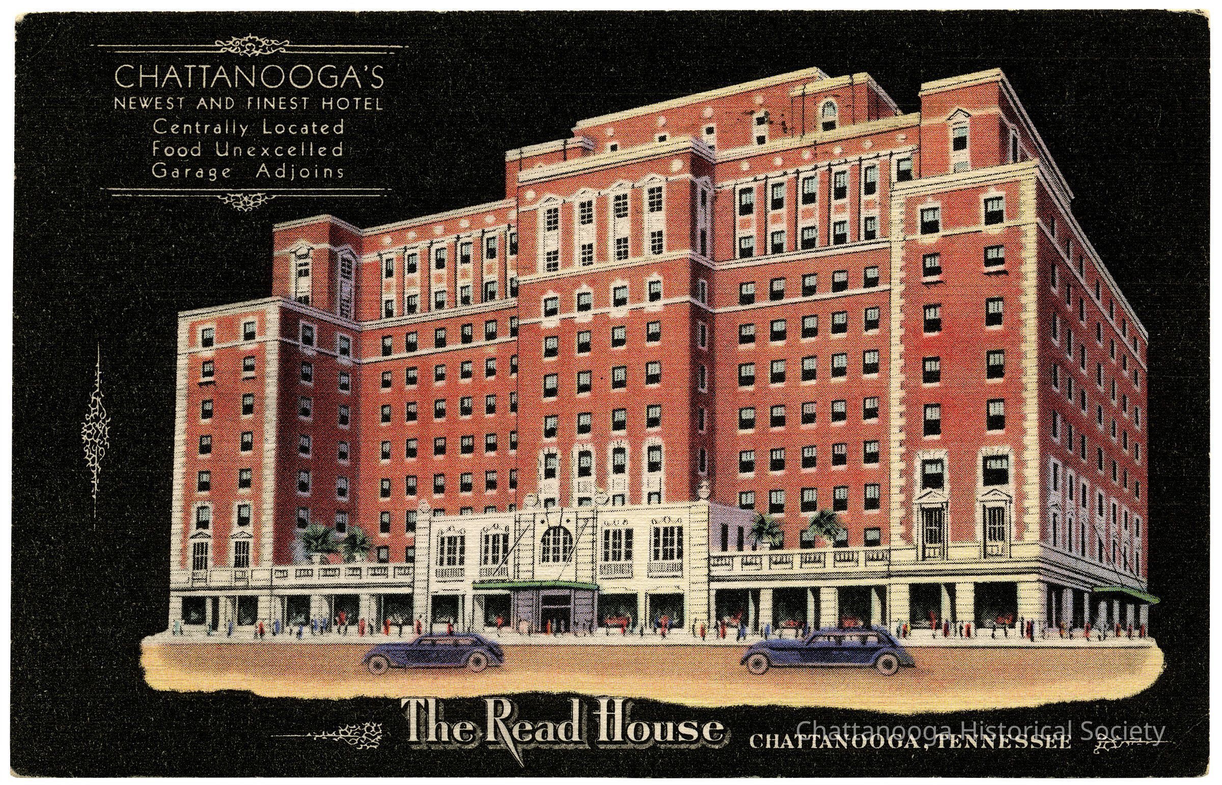 A postcard with the front showing the Read House on a black background with the description, "Chattanooga's newest and finest hotel, centrally located, food unexcelled, garage adjoins."