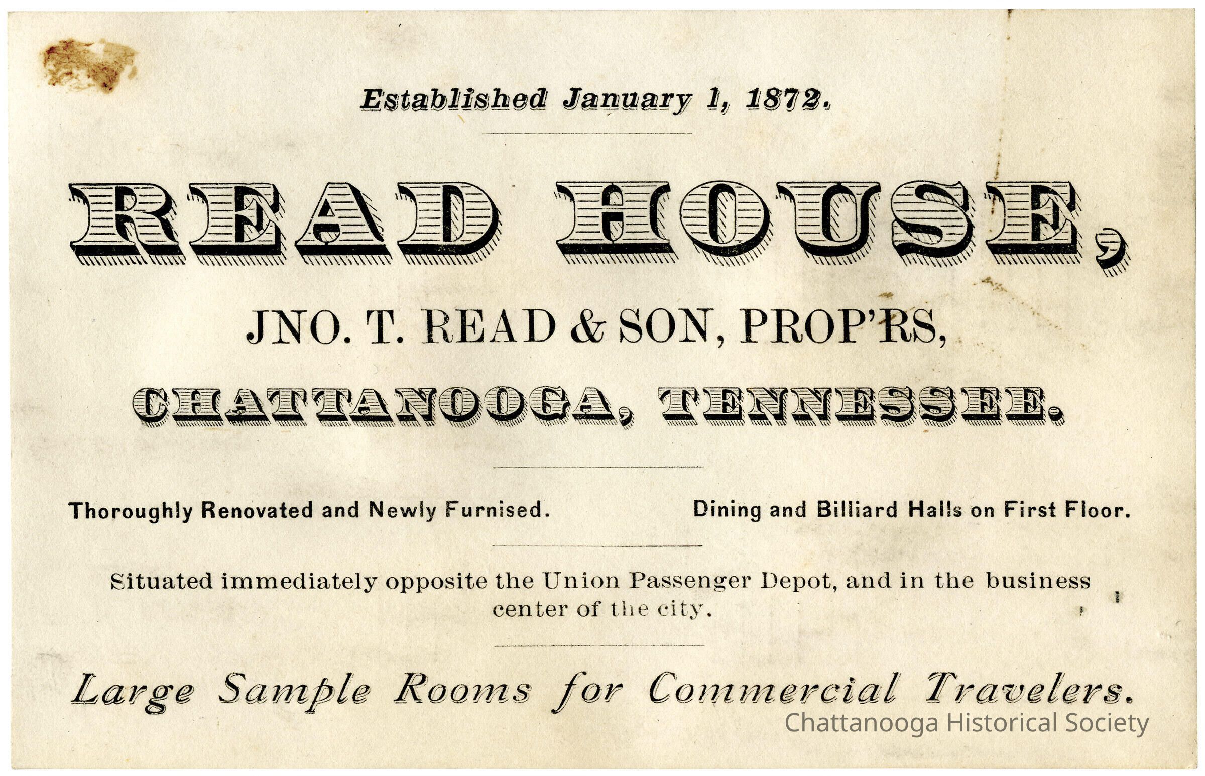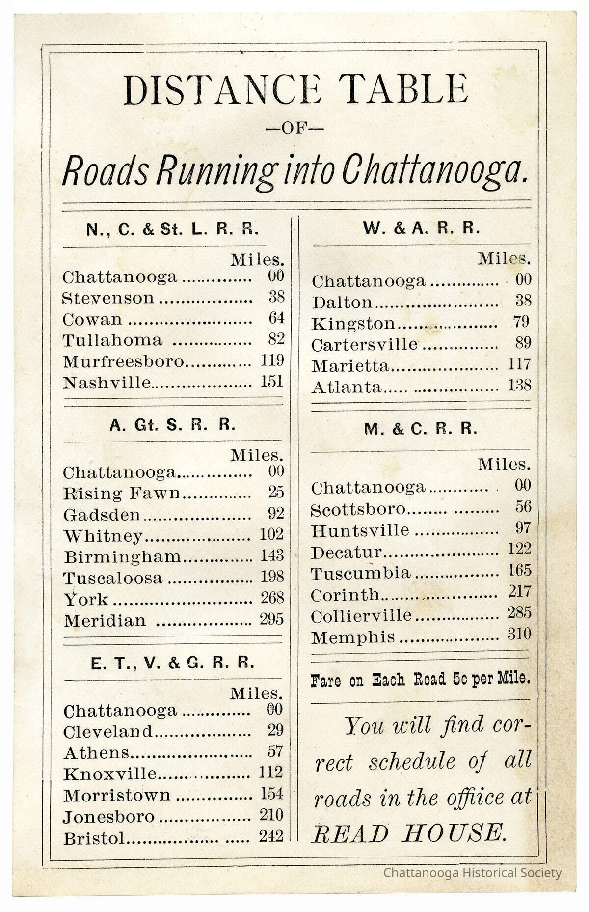 A trade card and a railroad distance table for the Read House.