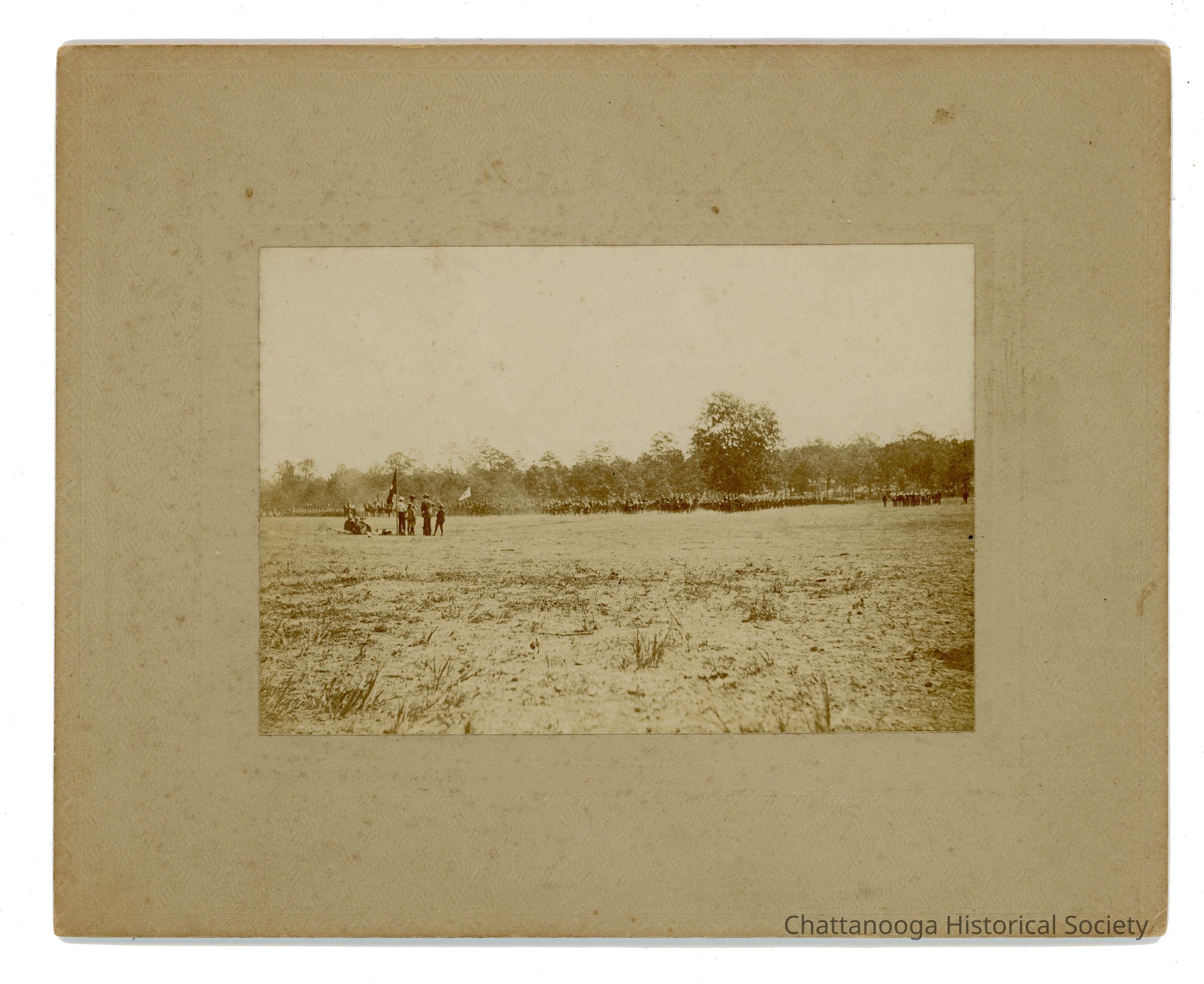Black and white photograph mounted on cardstock of service members under review at Camp Thomas during the Spanish American War training. The photograph shows a cluster of men in the midground viewing both mounted cavalry and infantry troops in formation. The review was taking place at Chickamauga Park, circa 1898.