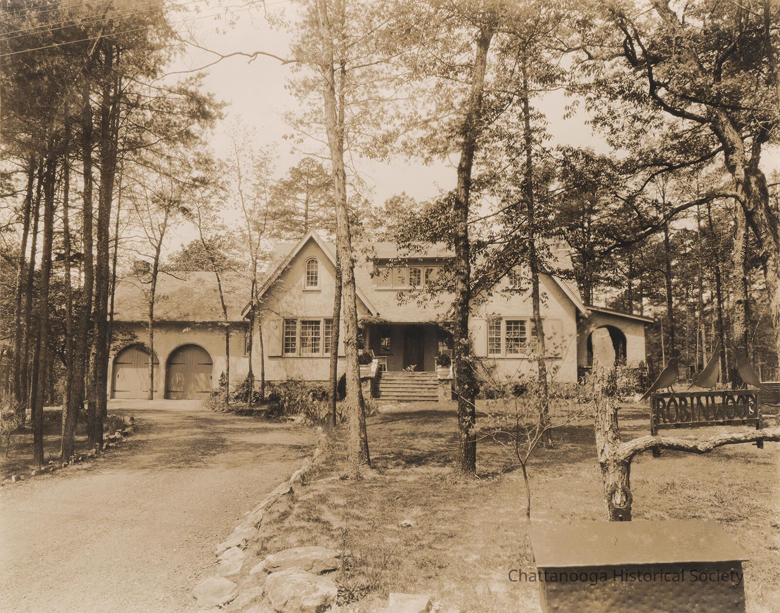 Black and white photograph of Frieda and Garnet Carter's home, Robinwood. The home features a central block that has two front facing gables with a recessed entry and a shed dormer above. There is a two car garage on the left side and a covered porch on the right. A mailbox is in the foreground with a decorative sign with three birds at the top, reading "Robinwood".