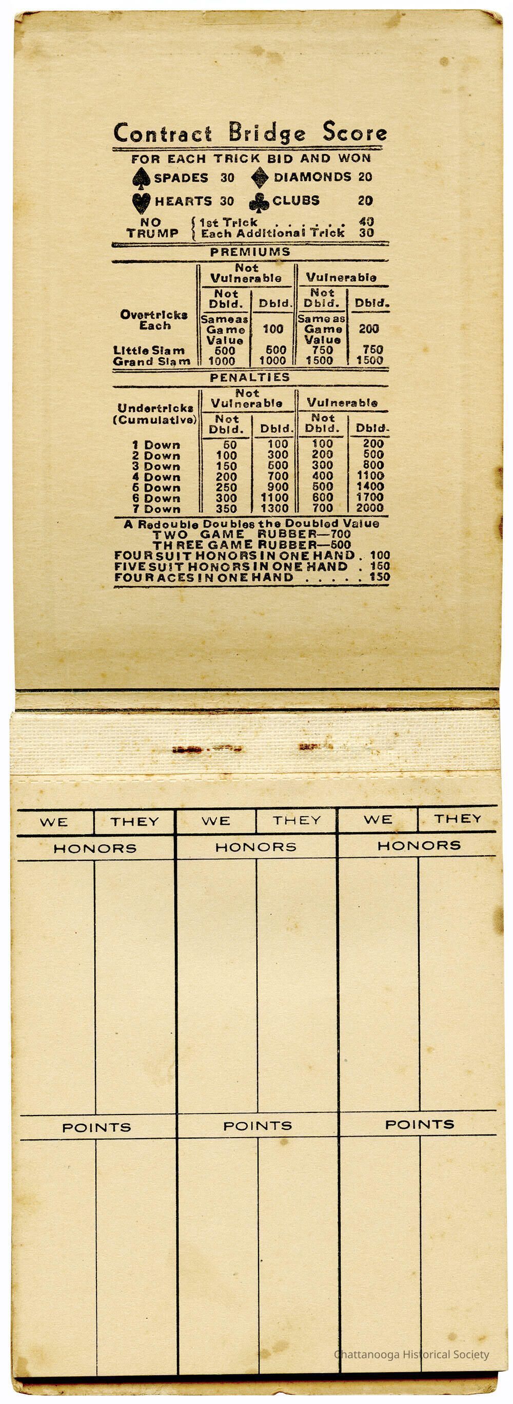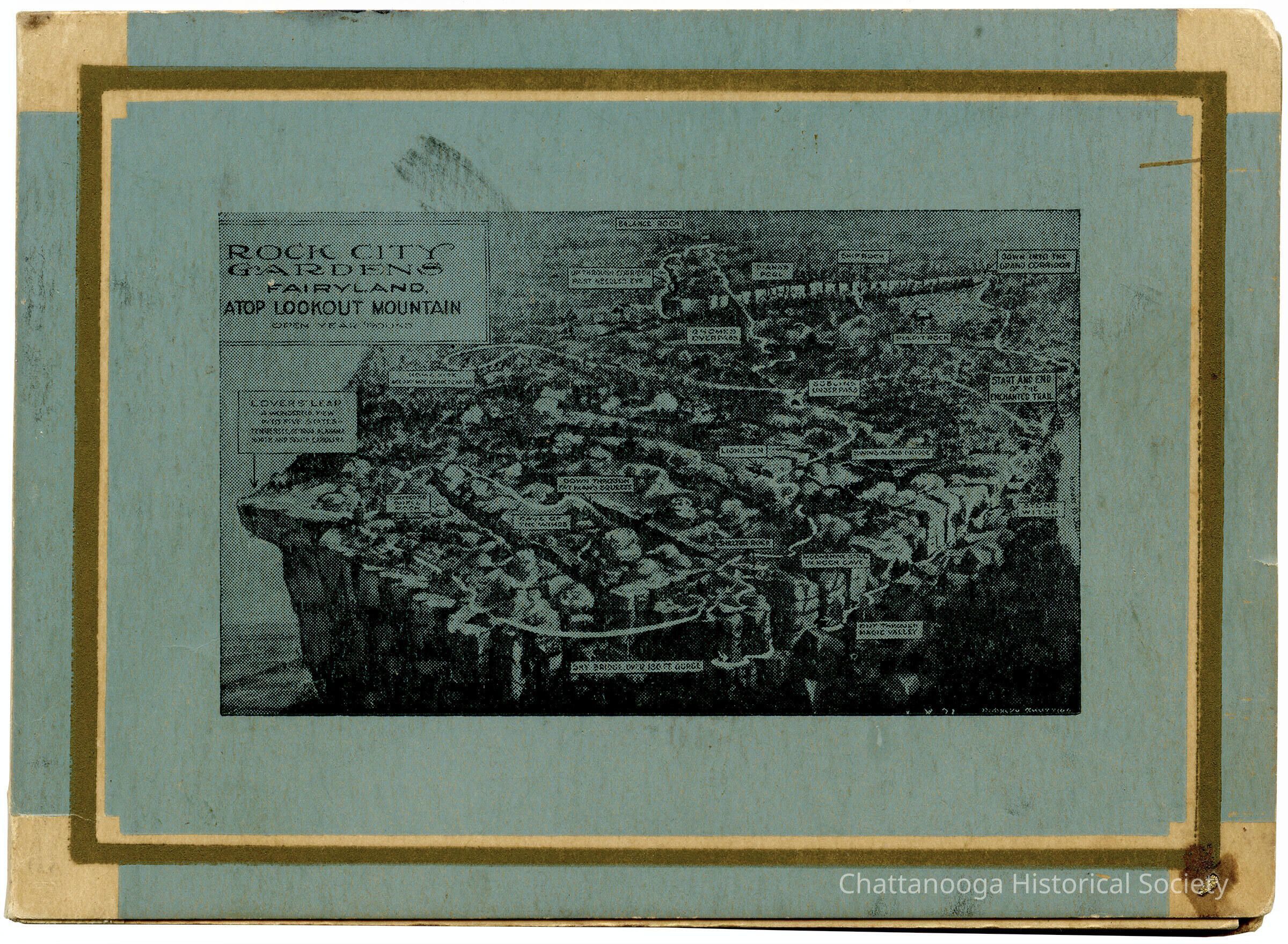 A bridge score pad featuring a map of Rock City Gardens, Fairylands, and Lookout Mountain, Georgia.The map features a birds eye view of the area including sites like Lovers Leap and Enchanted Trail. The booklet contains tear-out slips of paper that feature blank Bridge score sheets. The interior cover features a how-to for Bridge scoring.Collection