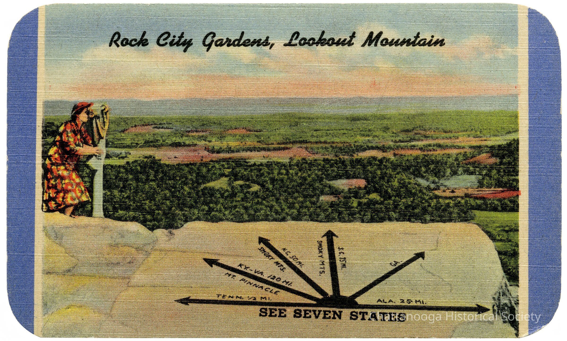 A 1952 pocket calendar compliments of Rock City Gardens on Lookout Mountain, Georgia. The calendar, which is printed on linen paper, has a color tinted image of the Rock City Gardens with a woman on the left using a viewfinder to see the view. The rear, which reads "Compliments of Rock City Gardens Lookout Mountain", has a 1952 calendar as well as a three inch ruler on the left side. The bottom reads "Highway 58 is the best road from Chattanooga, Tenn. up Lookout Mountain to Rock City."Collection