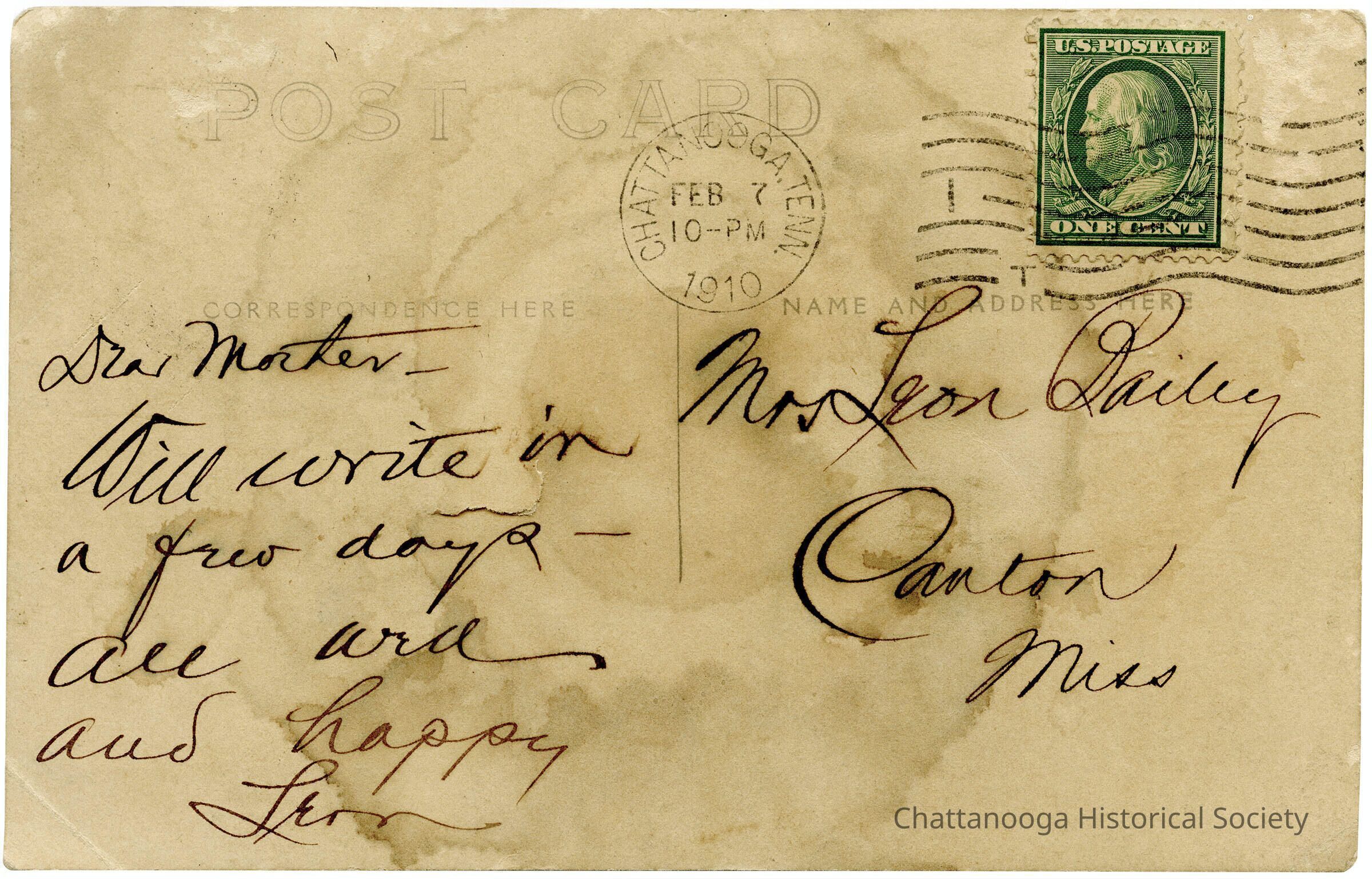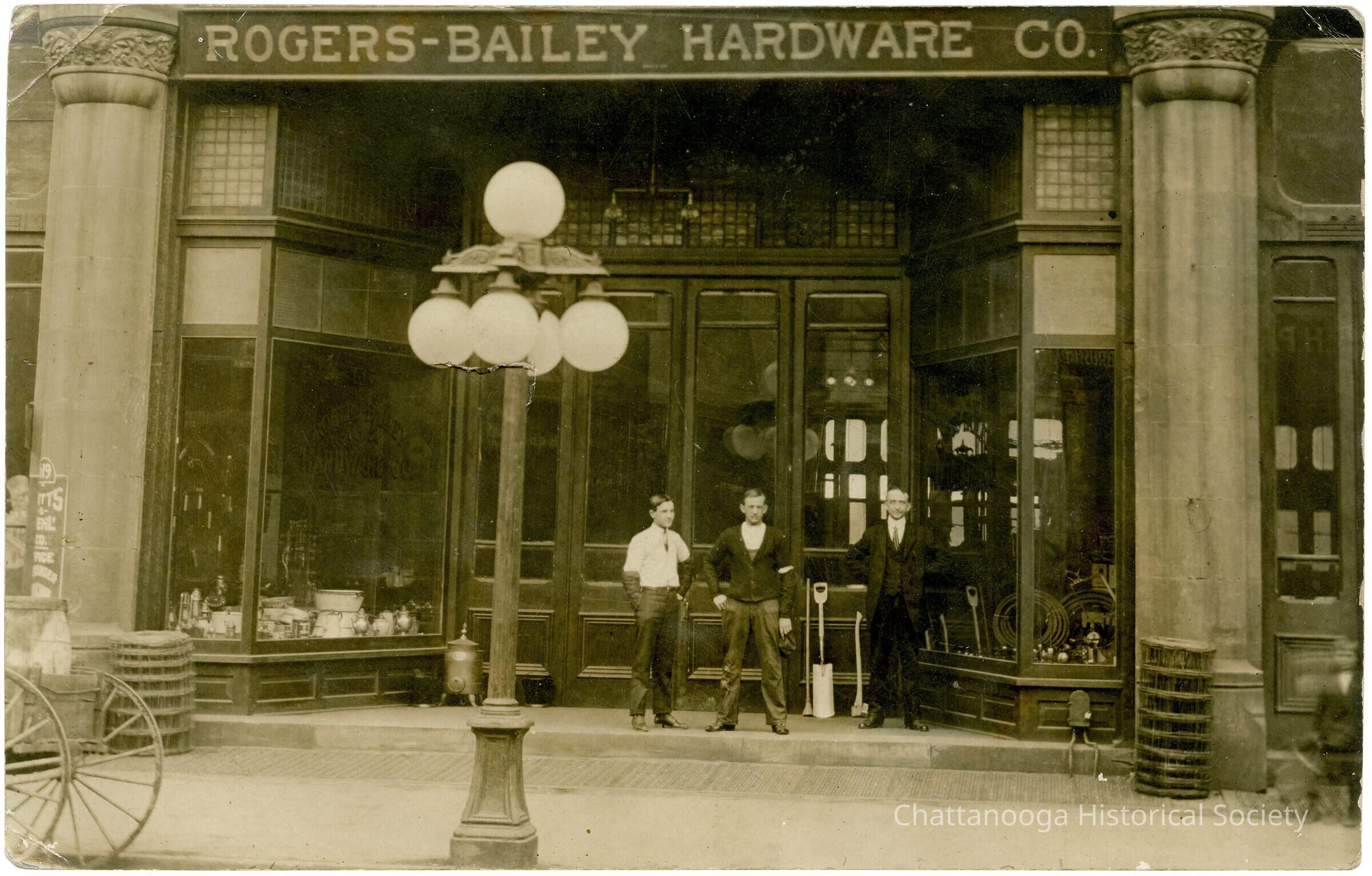 A gelatin-silver printed postcard with the front showing a photograph of three men posing in front of the Rogers-Bailey Hardware Company at 621 Market Street in Chattanooga, Tennessee.The postcard shows the display windows at the front of the store, a gas streetlamp at front, center, as well as the gas front door lighting. There is a large sign at the top that reads "Rogers-Bailey Hardware Co." in between two columns. Items of interest in the postcard include teapots, a washing machine, shovels, and other home items. The store also features prism lights at the transoms that help light the store's interior.Subject Person/Organization