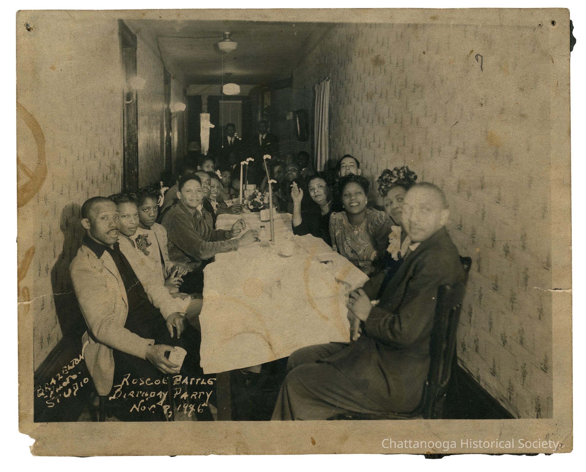 A black and white photograph of the birthday party held for Roscoe Battle. The photograph shows a long table set up in a hallway of a home, with party goers seated on both sides. There are two men in suits standing in the background at the far end of the hall. The negative has been marked, at bottom left, to say "Brazelton Photo Studio, Roscoe Battle Birthday Party Nov. 8, 1946".Photograph Details