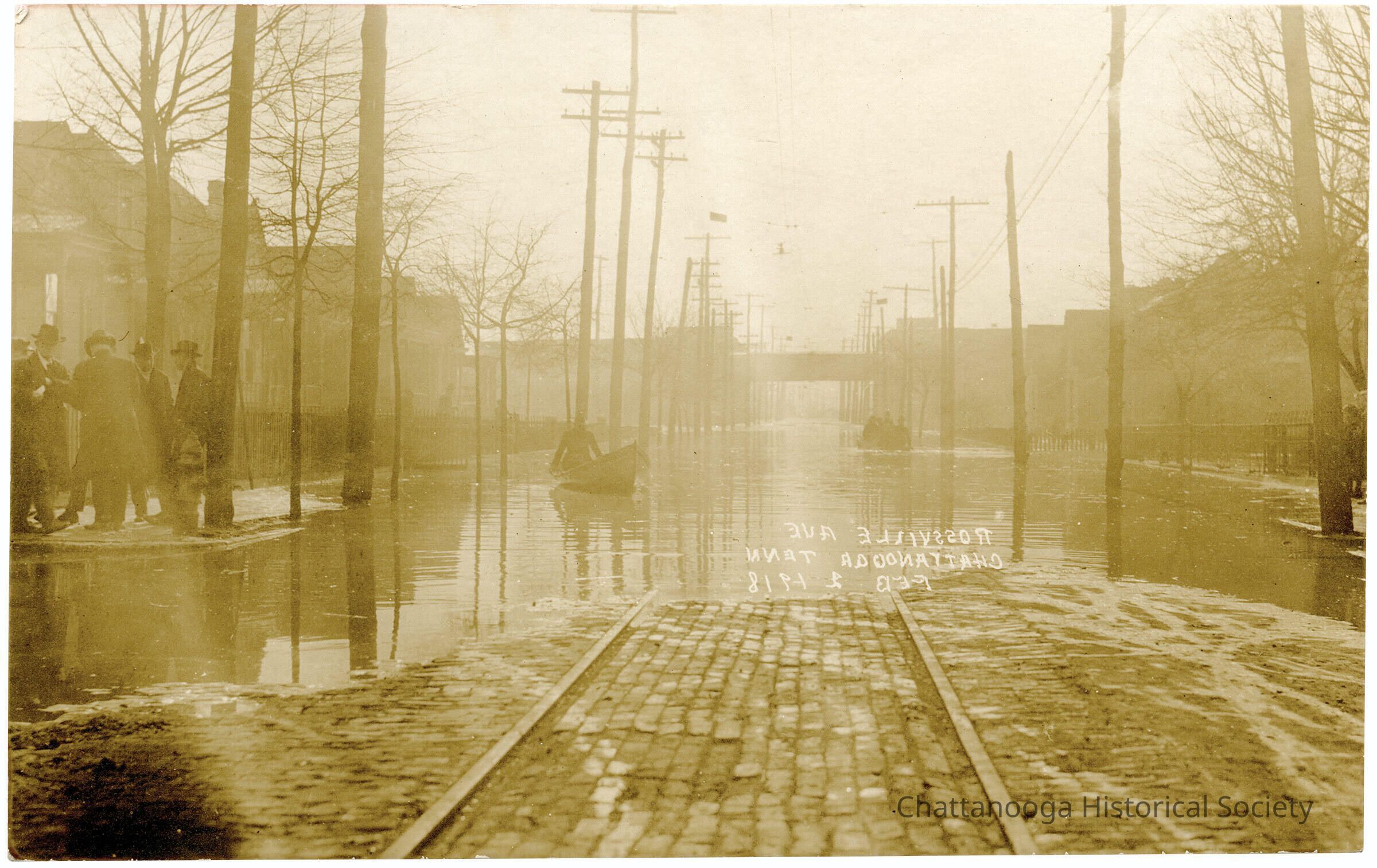 A postcard with the front showing a photograph of flooding along Rossville Avenue following the January 1918 flood. The writing on the negative (which is reversed) reads "Rossville Ave, Chattanooga Tenn, Feb 1 1918". The postcard shows a set of trolley tracks at center running into the flood waters. A group of men stand to the left and there appears to be two canoes with people in the mid- and back-ground.Subject