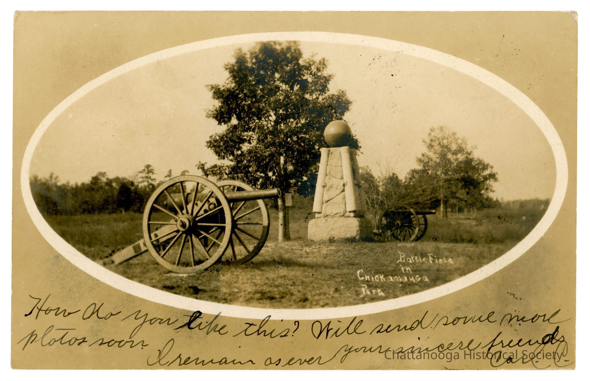 Real photo postcard showing the 6th Ohio Battery Monument at Chickamauga Park Battlefield. The black and white image shows the monument at center with a cannon on either side. The monument itself, carved by C. H. Niehaus, is a tapered stone shaft with four cannon tubes at each corner and a sphere at the top. The photograph is in an oval frame with a white border. At the bottom, a note to the addressee reads "How do you like this? Will send some more photos soon. I remain as ever your sincere friend Carl C."Subject Person/Organization