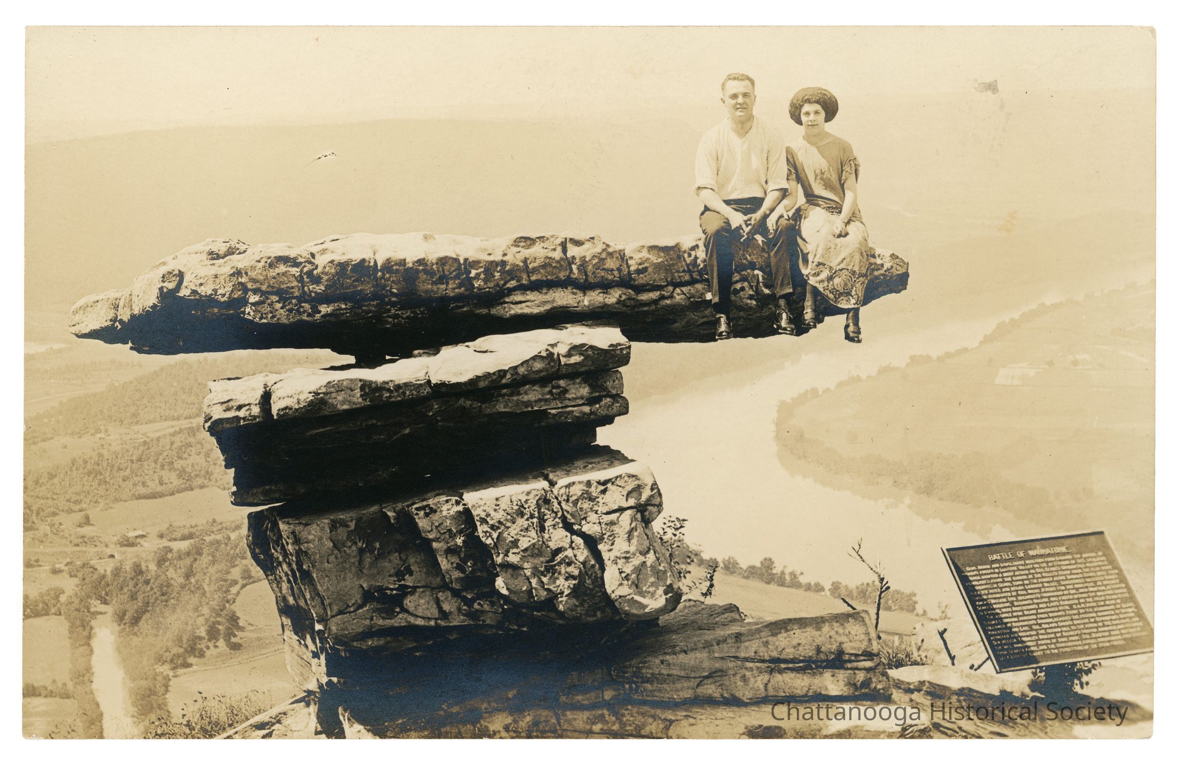 Black and white real photo postcard showing a man and woman sitting on the rock formation known as Umbrella Rock on Lookout Mountain, Tennessee. The woman is wearing a mid-1920s day dress with an embroidered hem. The man beside her is wearing a dark pair of trousers with a light buttoned up shirt. The "Battle of Wauhatchie" marker can be seen to the right corner of the view, with the Tennessee River in the background.Photograph Details
