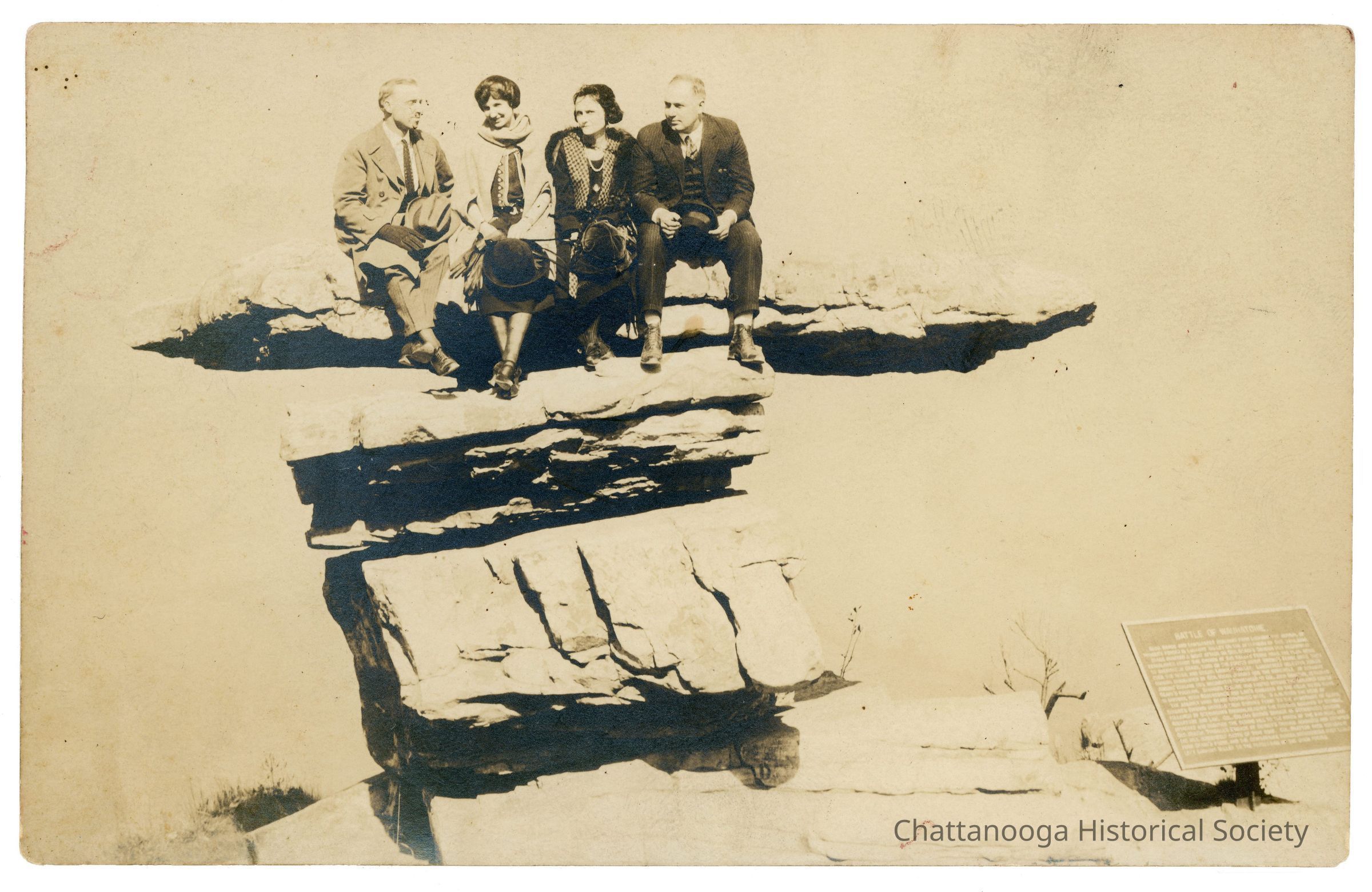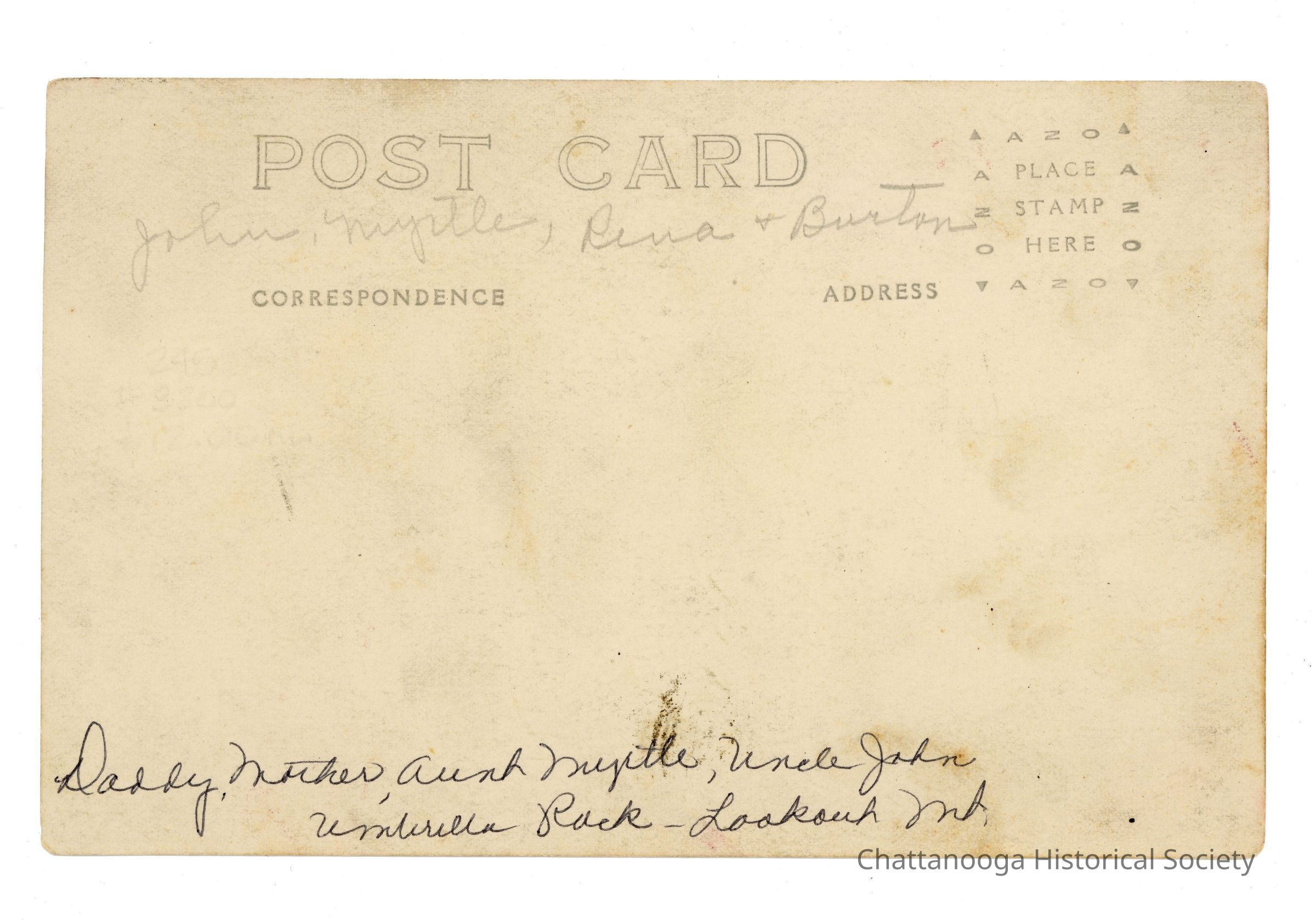 A black and white photograph developed on postcard paper showing two couples on Umbrella Rock. The women are dressed in long dresses and coats holding dark cloche style hats. They are flanked by two men, one wearing a lighter colored suit and the other a darker one. Written in pencil on the verso, top "John, Myrtle, Rina, & Burton". Below that along the bottom edge in black ink, reads "Daddy, Mother, Aunt Myrtle, Uncle John | Umbrella Rock - Lookout Mt."Photograph Details