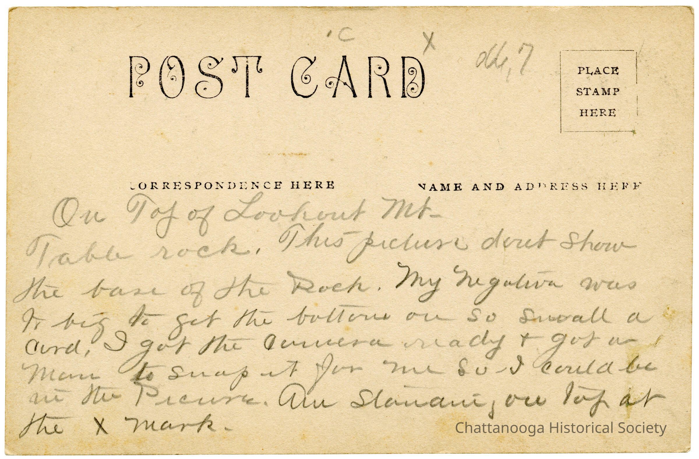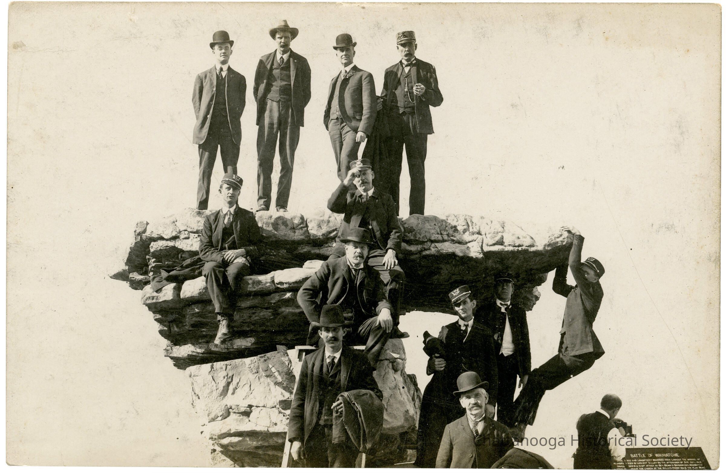 A postcard with the front showing a photograph of several men standing and sitting on Umbrella Rock atop Lookout Mountain, Tennessee. Six of the men are wearing flat conductor-style hats. There is a gentleman standing to the right, below the rock, who appears to be taking a photograph of the valley below. A sign at the bottom left describes The Battle of Wauhatchie that took place in the valley below.