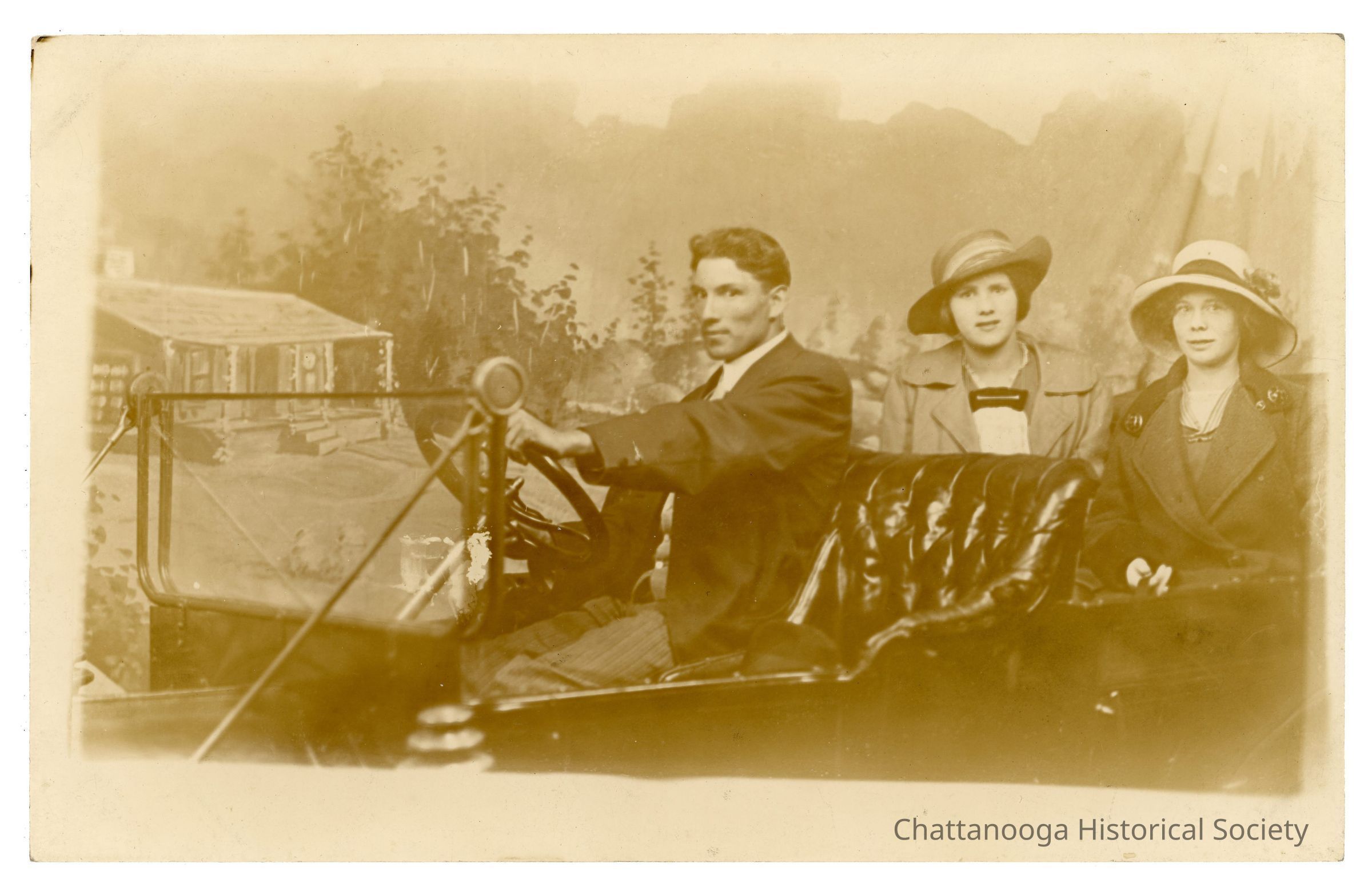 Black and white photograph developed on postcard paper showing a man and two women posing in a lefthand driven automobile. The man, in the front seat, is wearing striped pants with a vest and dark coat. The two women are in the seat behind him, both wearing wide brimmed hats and jackets. The backdrop behind them as a painted scene of a cabin in the woods.Photograph Details