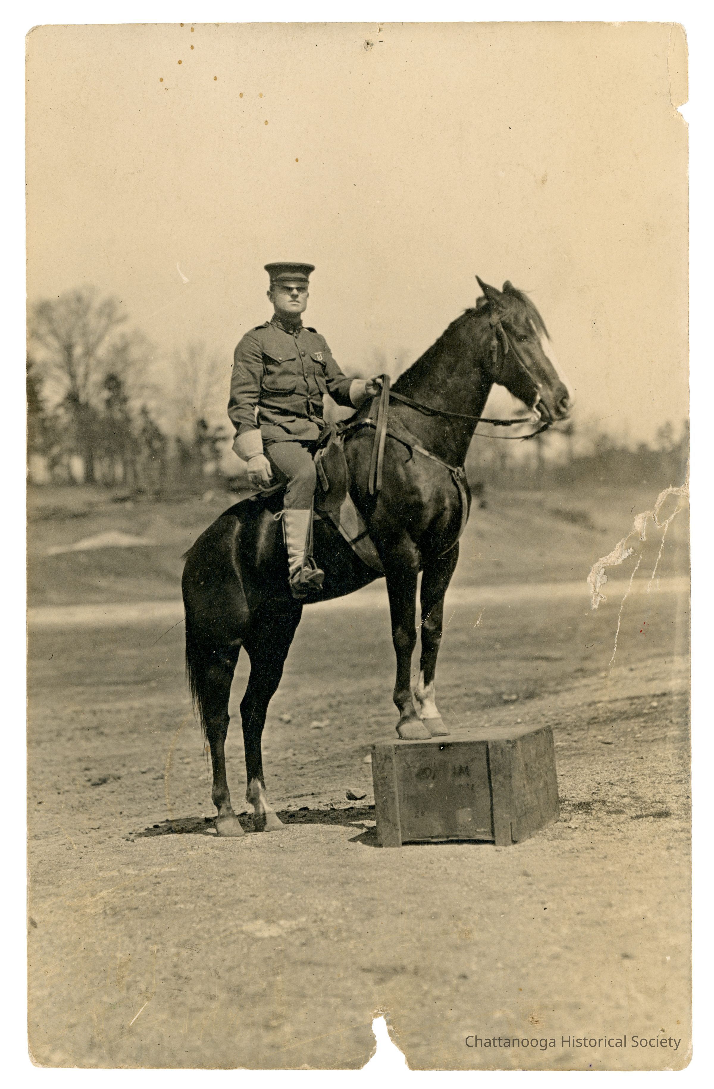 A black and white photograph developed on postcard paper showing a member of the United States Cavalry mounted on a dark horse. The horse is standing with his front legs perched on a wooden box. The man is wearing a single-breasted service coat with a badge on his top left pocket. A sergeant's rank insignia patch is on his shoulder.