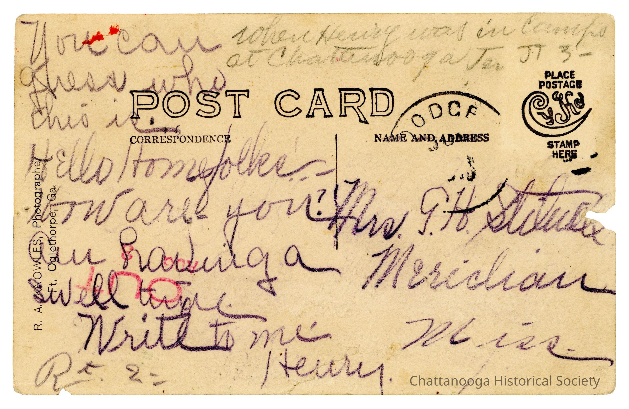 The message on the verso reads "You can | guess who | this is. | Hello Home folks | How are you? | Am having a | swell time | Write to me. | Henry." in blue pencil. A second note at top right reads "When Henry was in Camp | at Chattanooga Ten" .Subject Person/Organization