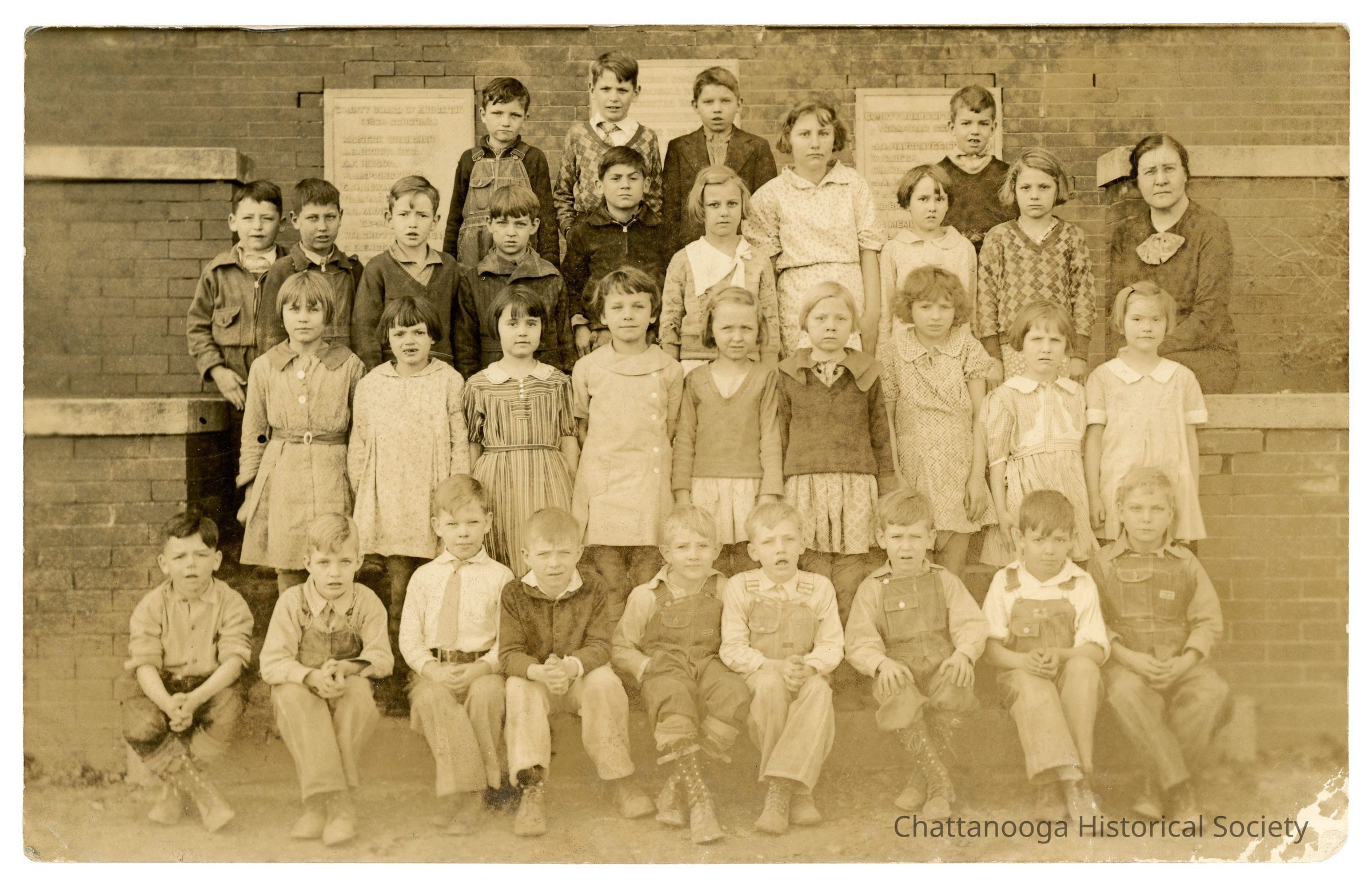 A black and white photograph showing a grade school aged group posing for a class photograph. There are four rows of students standing on brick steps with a teacher seated on the ledge in the third row. Three markers behind the group list the Hamilton County Board of Education members from both the high school and the grammar schools.Photograph Details
