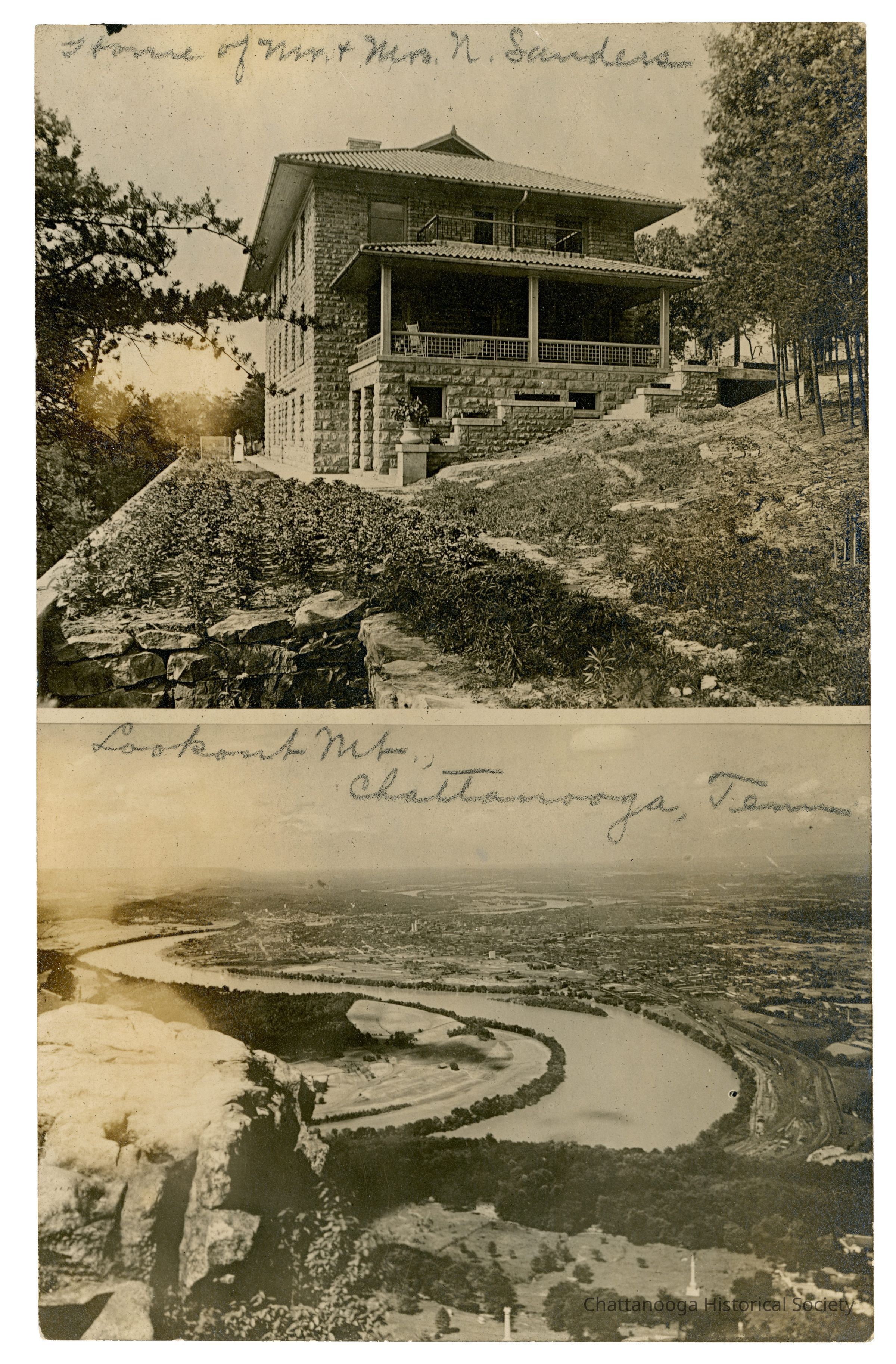 A black and white photograph developed on on postcard paper that is divided in half, with an image of the Newall Sanders home at top and an aerial view of downtown Chattanooga and Moccasin Bend from Lookout Mountain. The view of the home shows a rock façade facing the valley below with a side, full façade porch on the side. The top image is labeled "Home of Mr. & Mrs. N. Sanders" in pencil along top edge. The bottom view shows the bend of the Tennessee River as it wraps aroung Moccasin Bend. The monuments around Craven's House can be seen near the image bottom and it is titled "Lookout Mt., | Chattanooga, Tenn" in pencil.