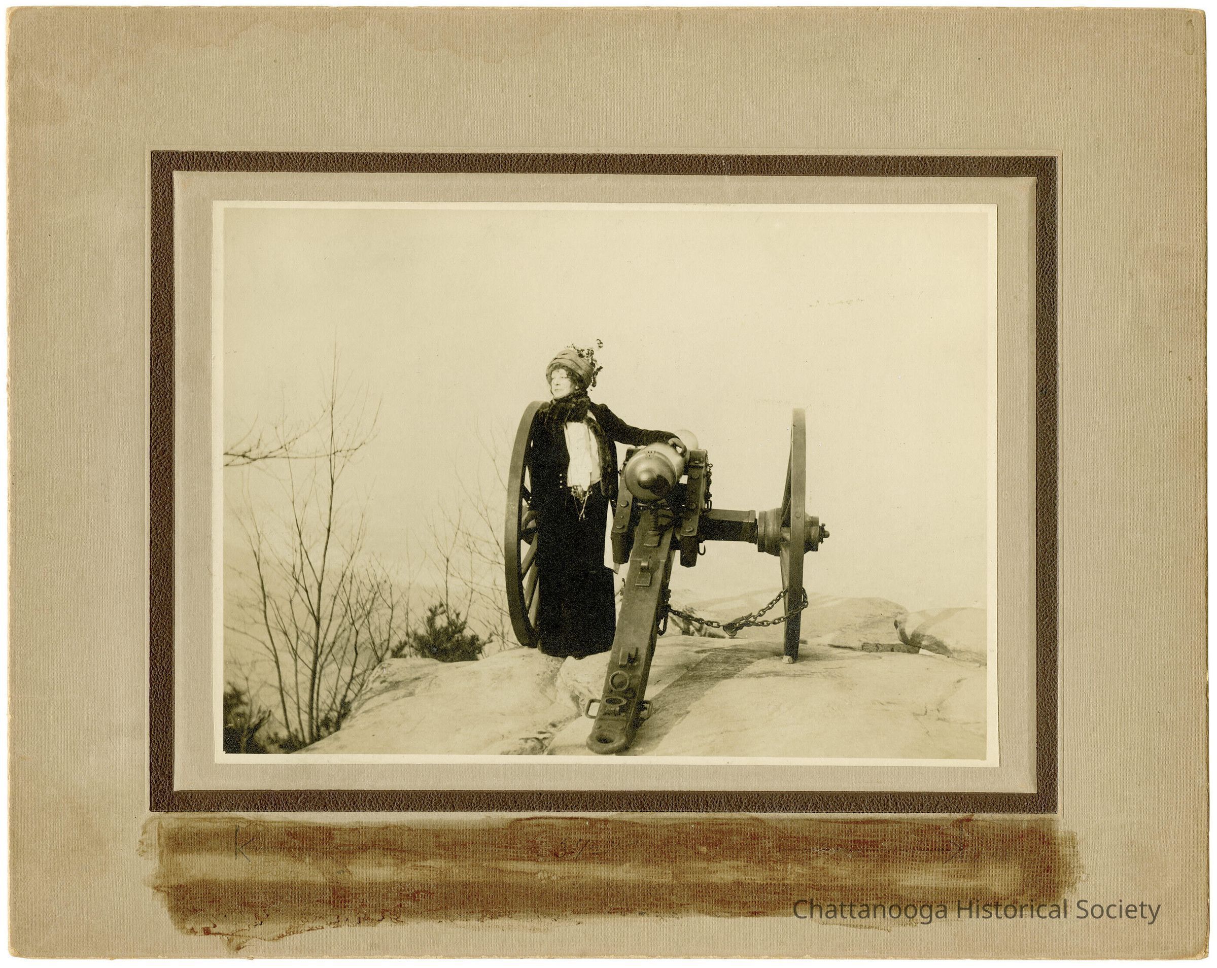 A black and white photograph mounted on a cabinet card showing famed French actress Sarah Bernhardt. She is photographed at Garrity's Alabama Battery atop Lookout Mountain, Tennessee in 1911. The actress is wearing a dark skirt and white shirtwaist with a dark coat left unbuttoned. A dark scarf is wrapped around her neck with a brimless hat with flowers on the top. Her hand is placed on the barrel of a cannon.