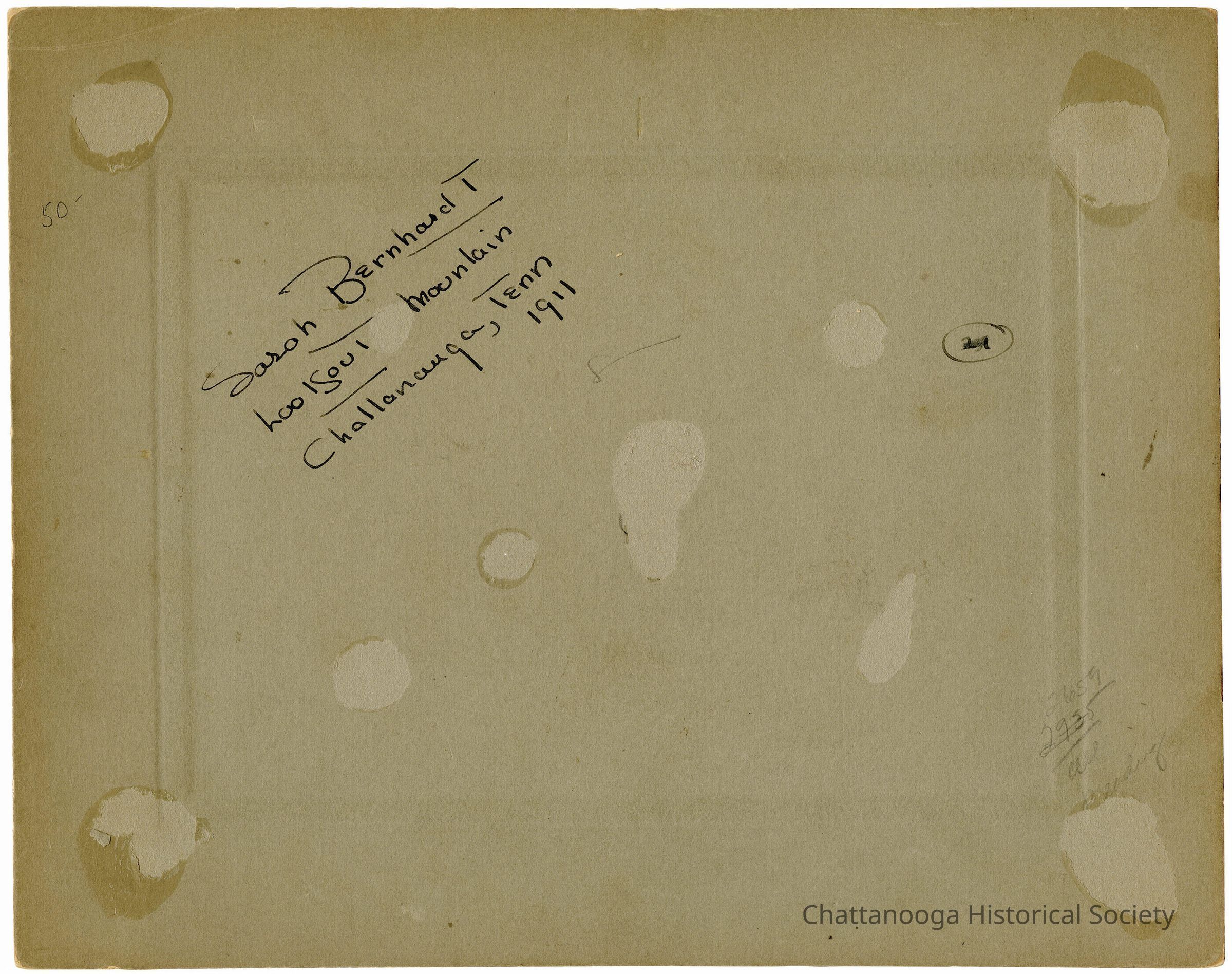 There is dry adhesive residue below the photograph on the card where a label was removed at some point prior to acquisition. The rear of the photograph features black ink that reads "Sarah Bernhardt Lookout Mountain Chattanauga, Tenn 1911"