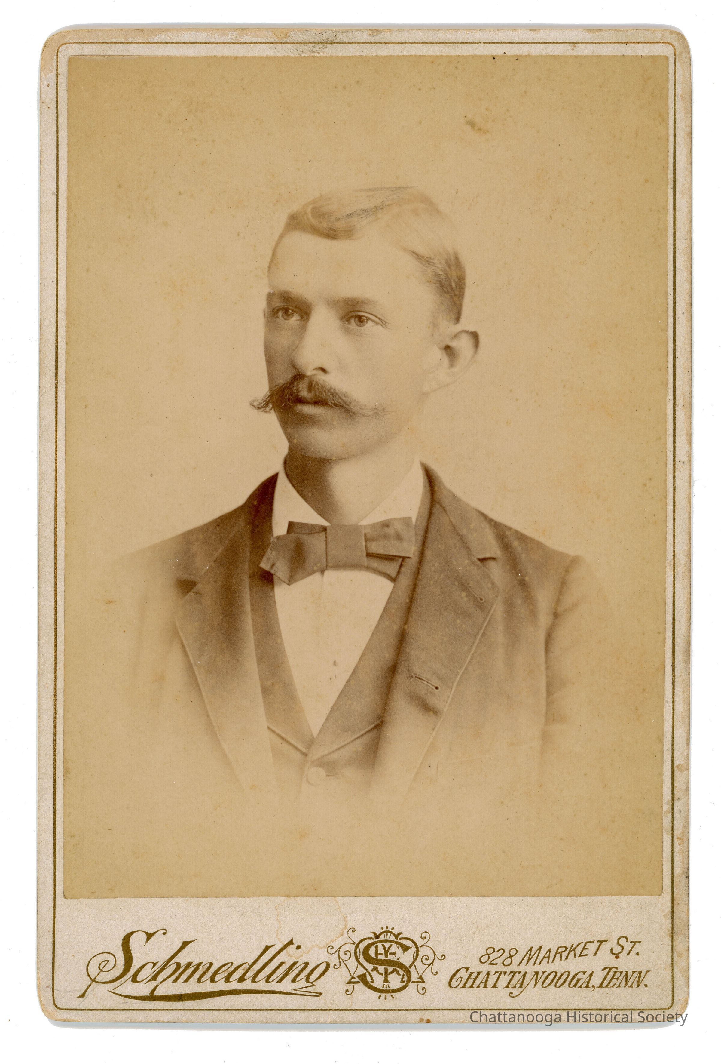 Black and white cabinet card photograph of an unidentified man identified. The studio portrait by Schmedling shows a younger man with a curling mustache, wearing a white shirt with a dark bow tie. He is also wearing a dark suit and vest. The photograph is marked "Schmedling, 828 Market St | Chattanooga, Tenn." in gold in the bottom gutter. The car also features the Schmedling graphic on the rear with a wildflower bouquet and "Scmedling | Photographer | 828 Market St, Chattanooga, | Tenn." in gold.Photograph Details