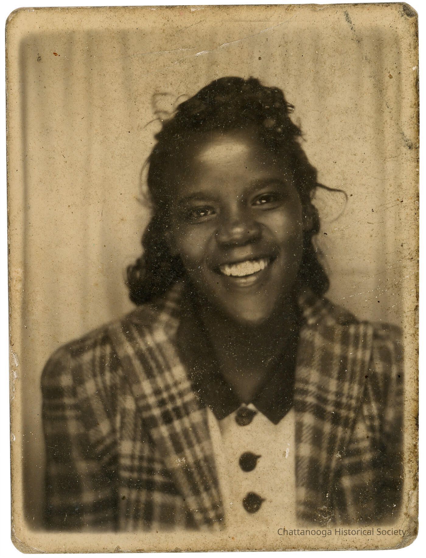 Black and white school photograph of a smiling young woman. The girl is wearing a plaid coat over a shite button up shirt with dark buttons and collar. The photograph is likely a school portrait as the girl is sitting behind a generic curtain backdrop and the rear reads "Mr. Carson, The First"Photograph Details
