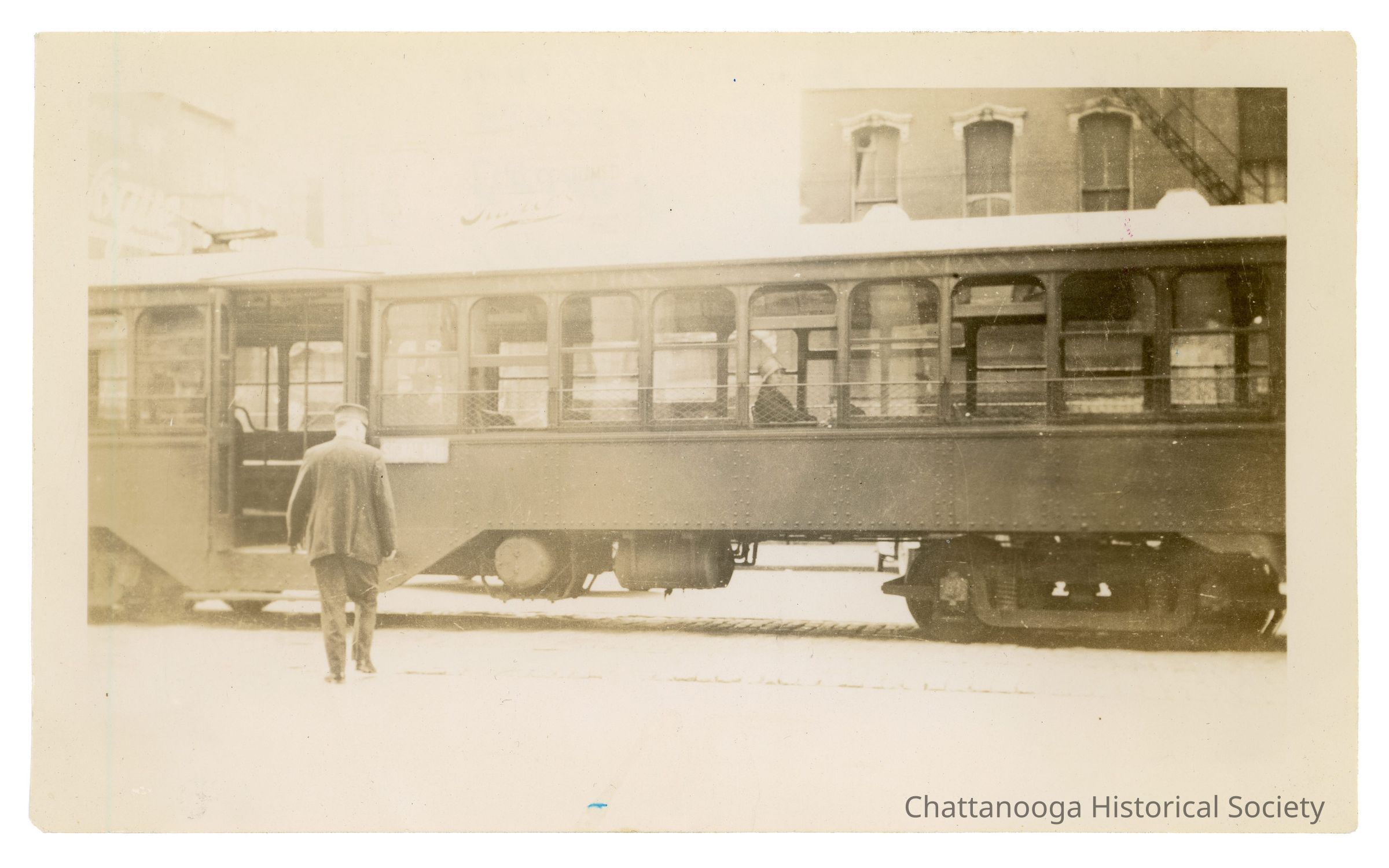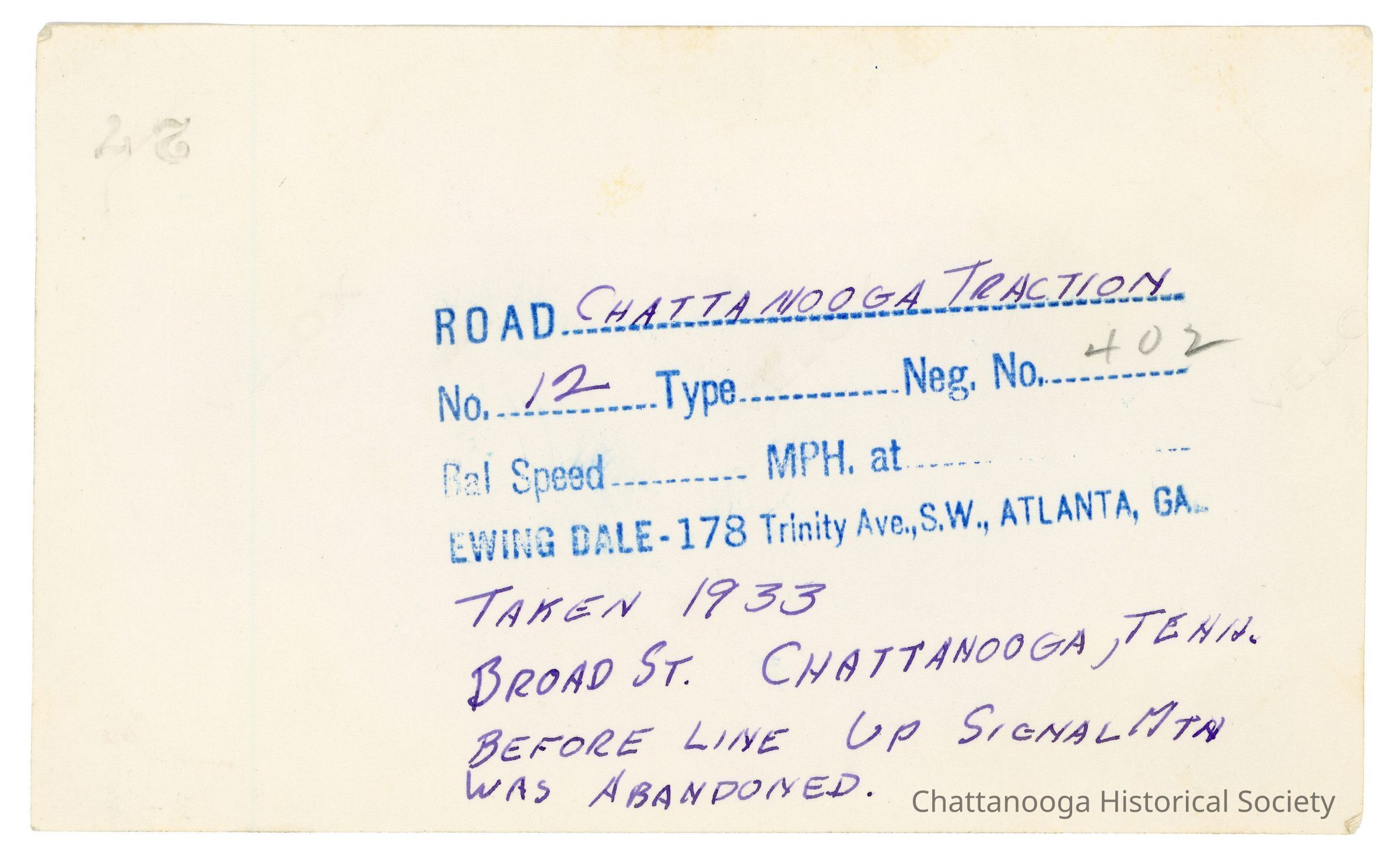 A black and white photograph showing a car of the Chattanooga Traction Company (Number 12) on Broad Street in 1933. The photograph shows a lone woman seated near center of the car with a conductor approaching an open door. The verso is stamped in blue ink with a form with the blanks filled in, describing the view. The photograph is listed as being "Chattanooga Traction, No. 12 (Negative No. 402)." Handwritten at the bottom is "Taken 1933 | Broad St. Chattanooga, Tenn. | Before Line Up Signal Mtn Was Abandoned."Date(s) of Creation