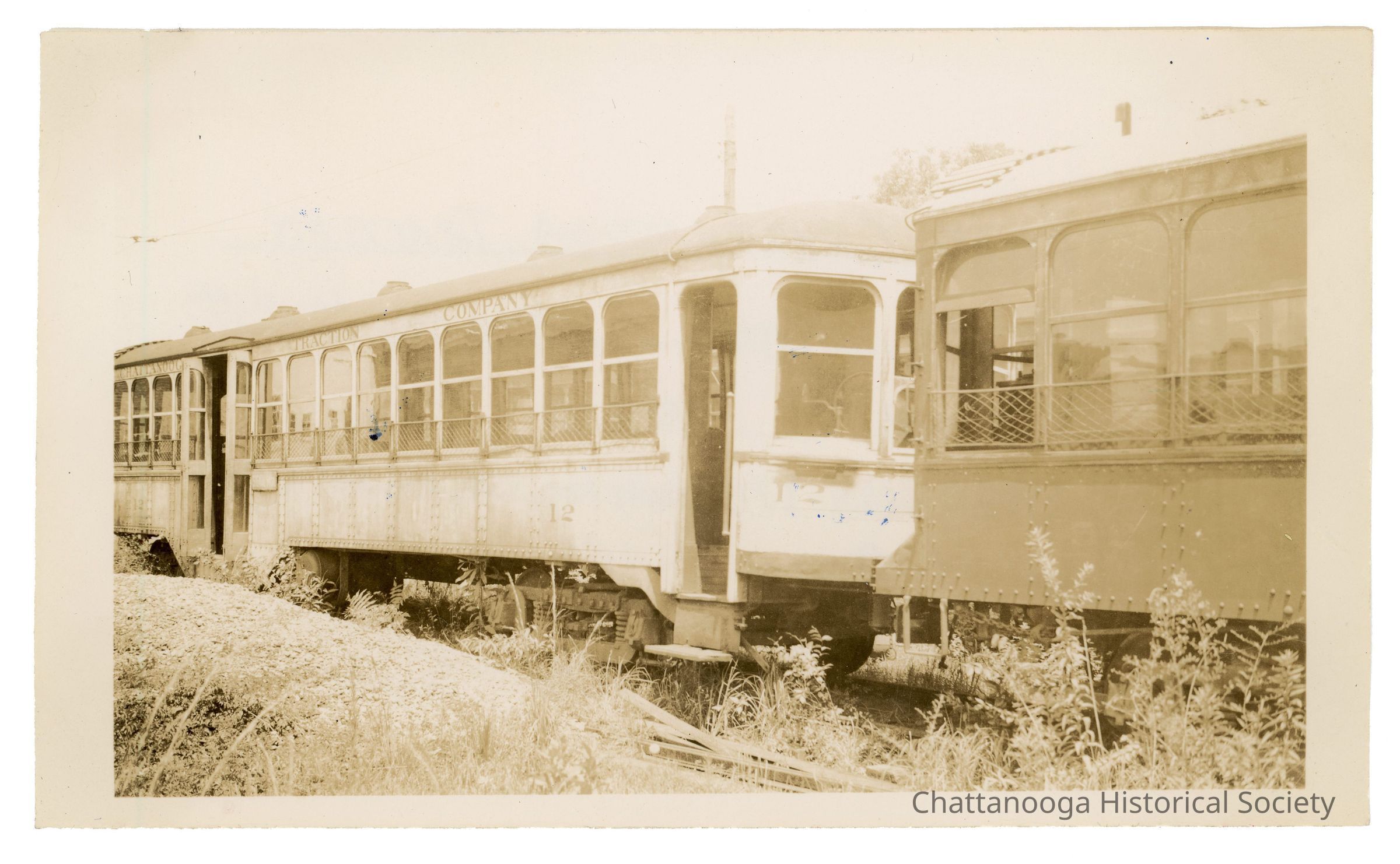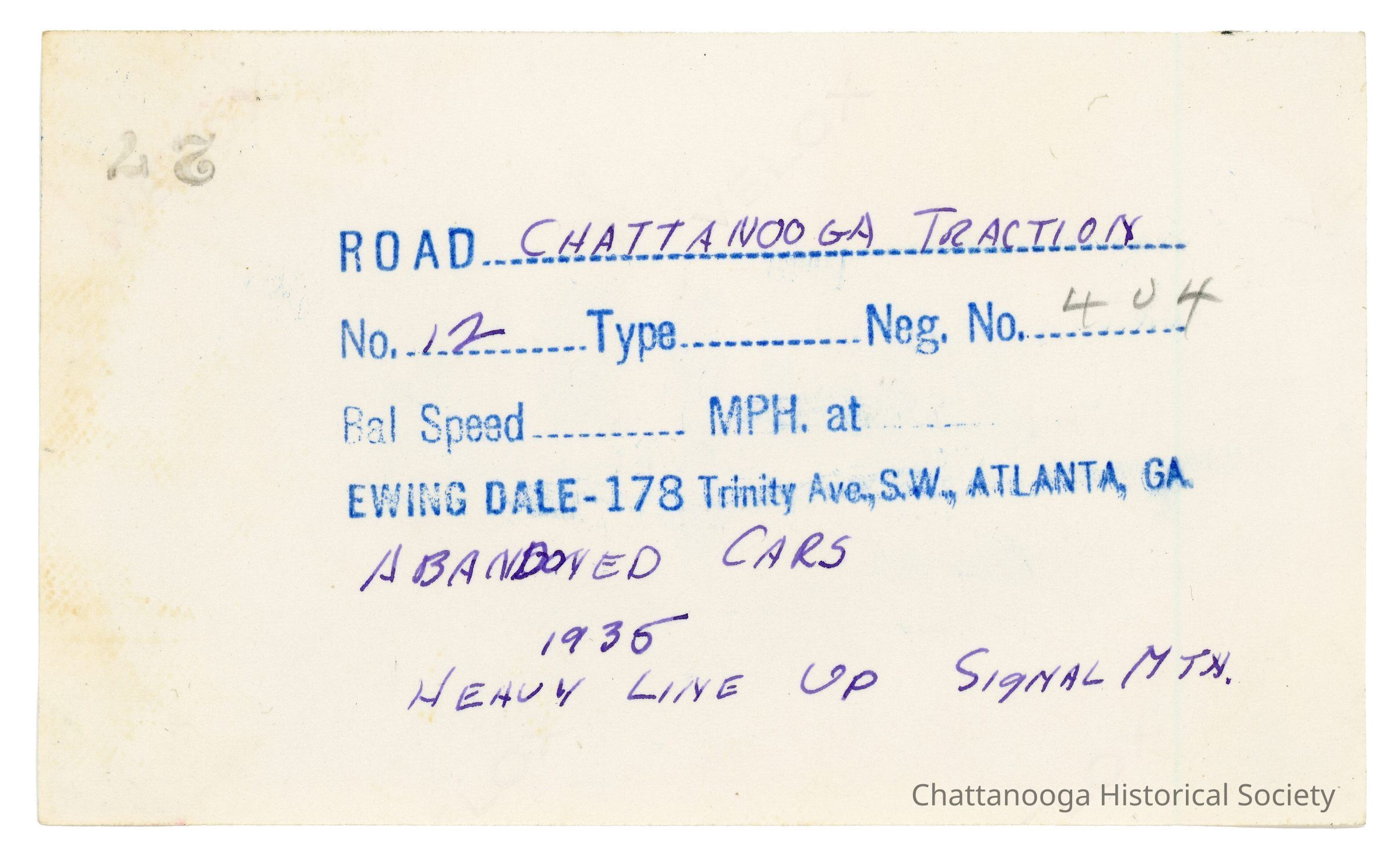 A black and white photograph showing two of the abandoned cars (Number 12) of the Signal Mountain Traction Company in the yard where they were stored. The verso is stamped in blue ink with a form with the blanks filled in, describing the view. The photograph is listed as being "Chattanooga Traction, No. 12 (Negative No. 404)." Handwritten at the bottom is "Abandoned Cars | 1935 | Heavy Line Up Signal Mtn."Date(s) of Creation