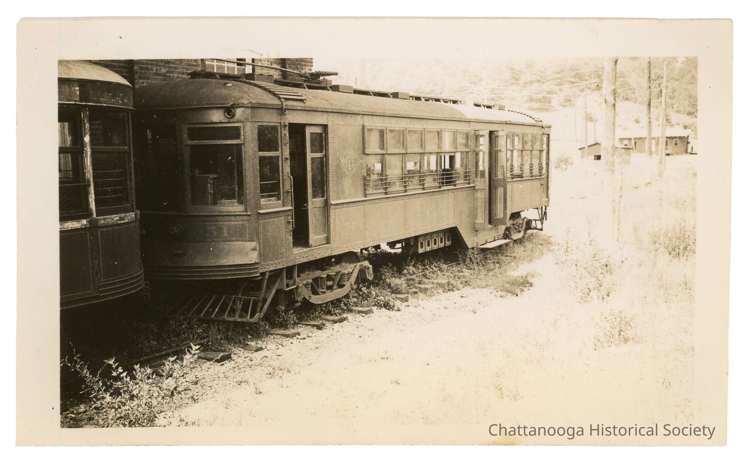 A black and white photograph showing two of the abandoned cars (Number 51) of the Signal Mountain Traction Company in the yard where they were stored. The verso is stamped in blue ink with a form with the blanks filled in, describing the view. The photograph is listed as being "Chattanooga Traction, No. 51 (Negative No. 403)." Handwritten at the bottom is "Abandoned | Heavy Line Up Signal Mtn."Date(s) of Creation