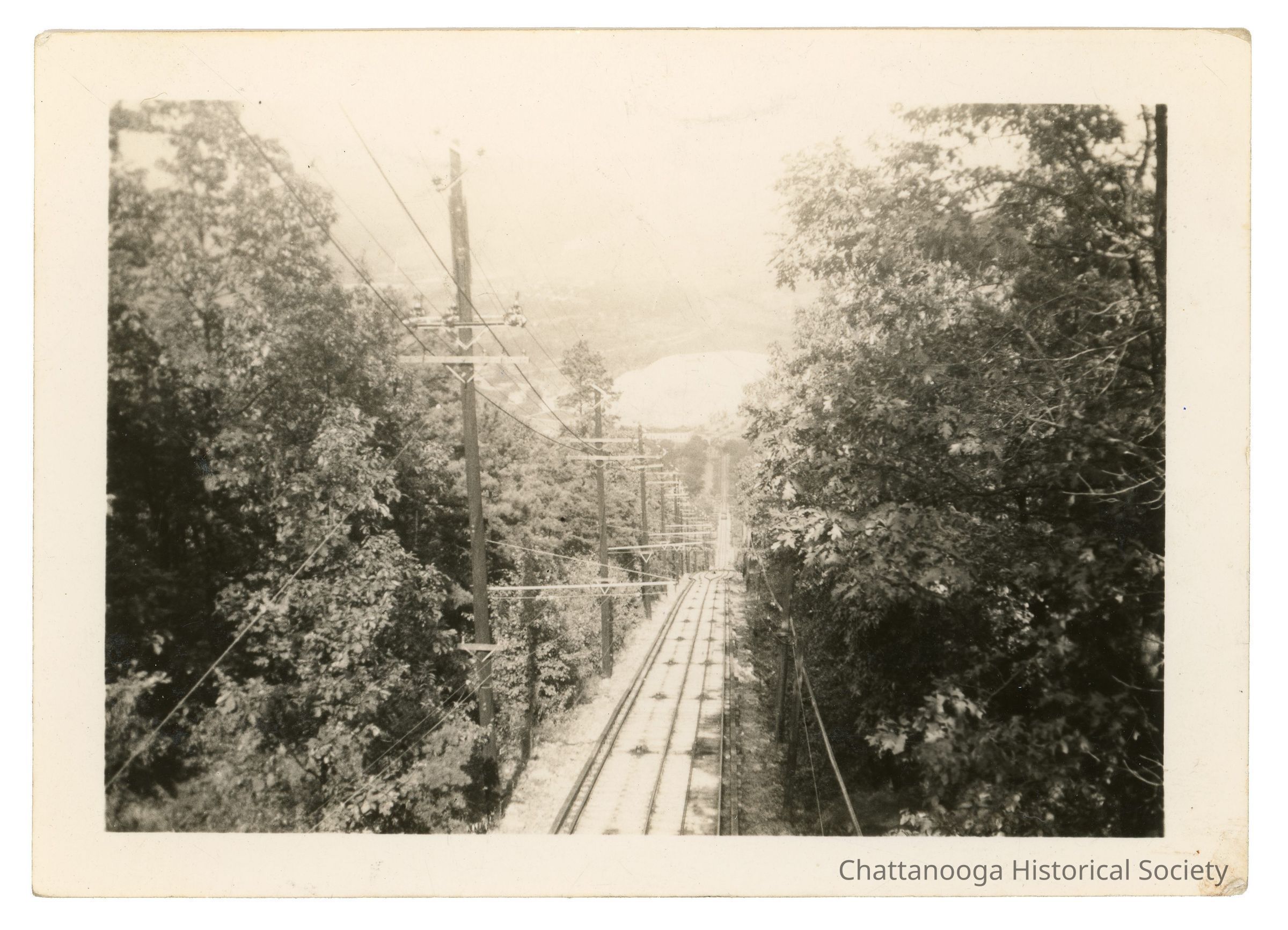A black and white photograph showing the view of St. Elmo from the Incline Railway on Lookout Mountain.Title