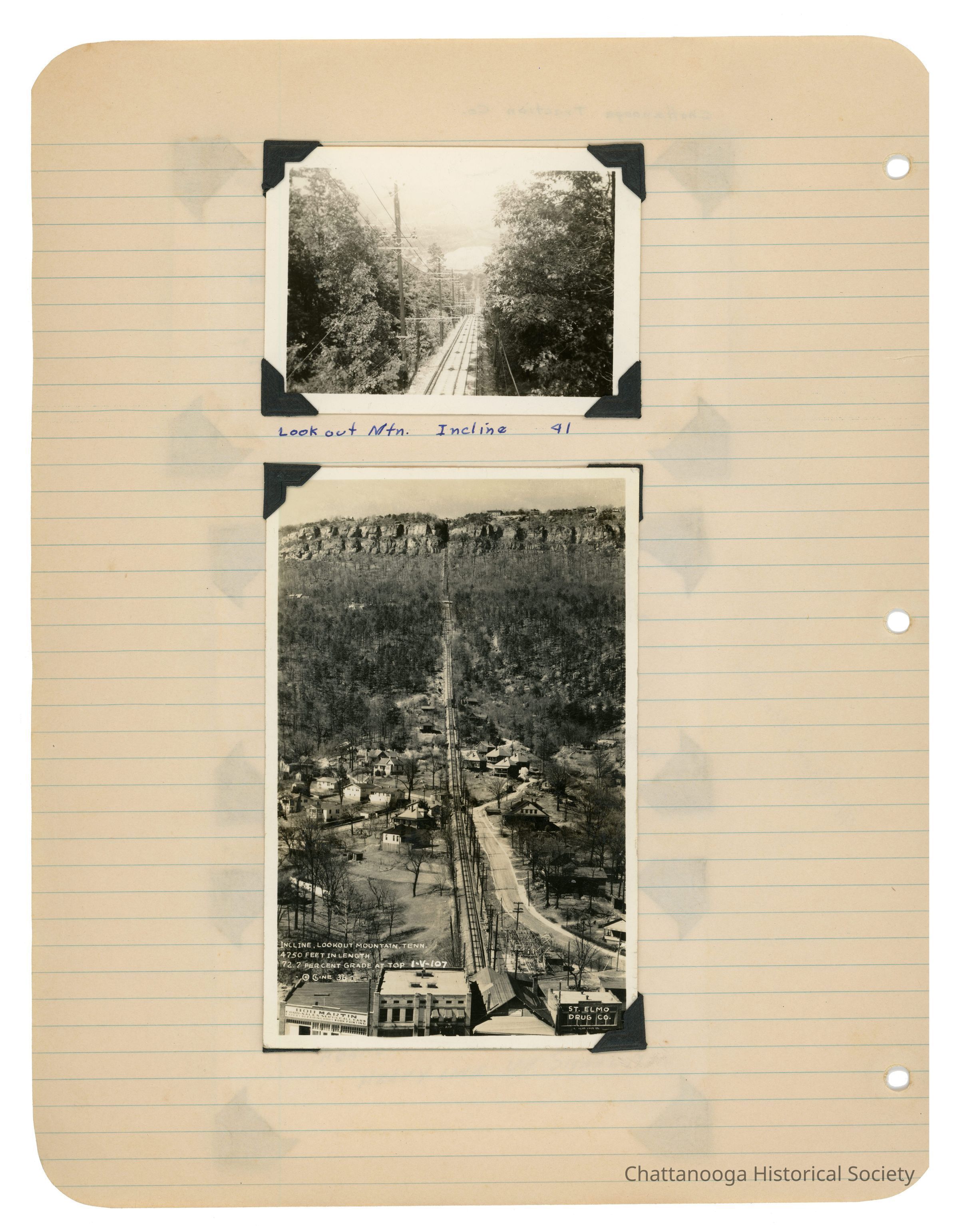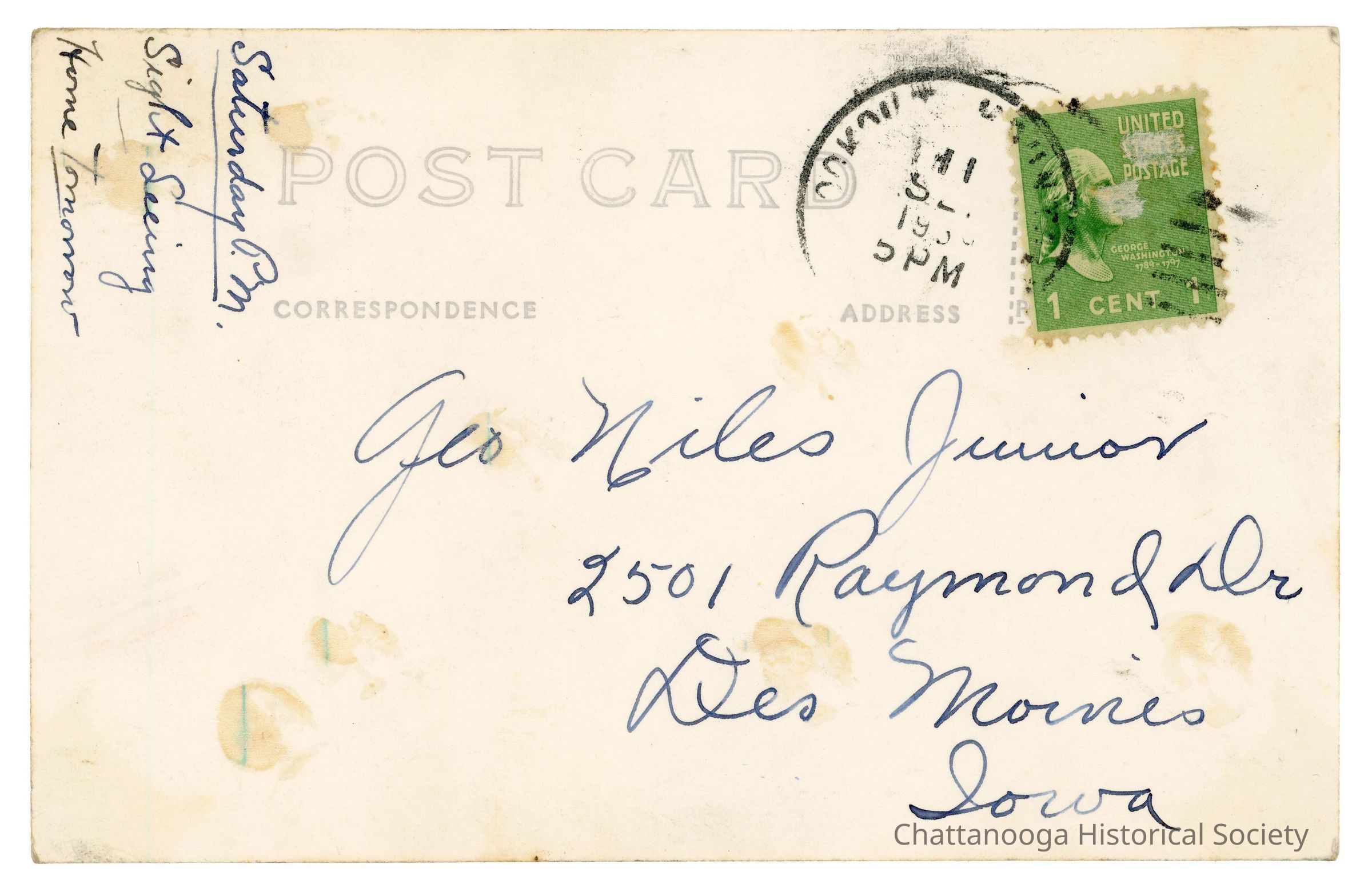 A black and white, real photo postcard showing a portion of St. Elmo's business district and the houses at the base of the Incline's track. The postcard is labeled "Incline, Lookout Mountain, Tenn. | 4750 Feet in Length | 72.7 Percent Grade At Top I-V-107 | © Cline 36" The message on the rear reads "Saturday P.M. | Sight Seeing | Home Tomorrow" and is addressed to Geo Niles Junior | 2501 Raymond Dr | Des Moines | Iowa"Creator