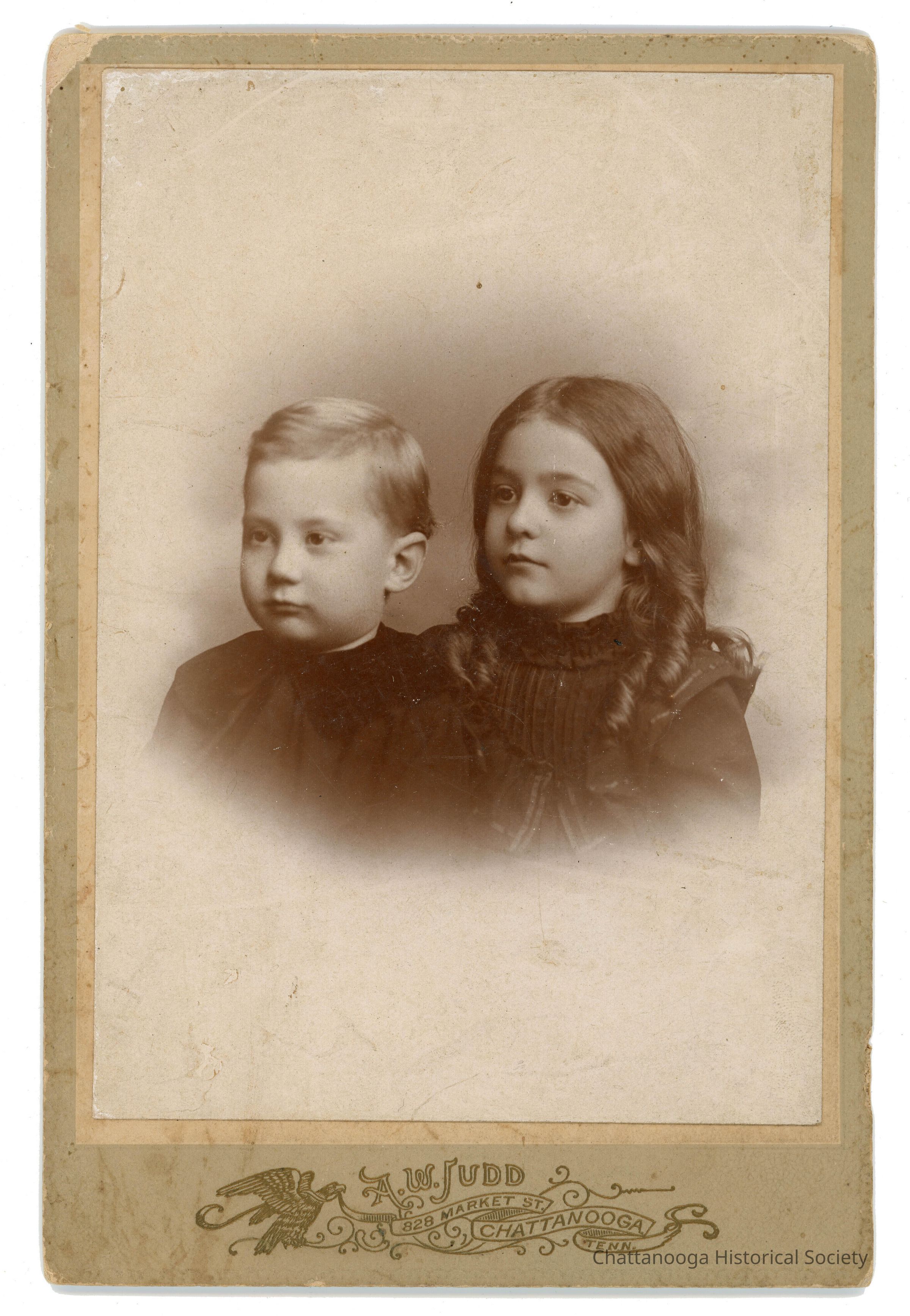 A black and white photograph mounted on a cabinet card of two young siblings. The little girls is wearing a black dress with a high neck and smocking. The younger boy on her side is wearing a wide collared, black top. The photograph is printed "A.W. Judd | 282 MARKET ST | CHATTANOOGA | TENN."