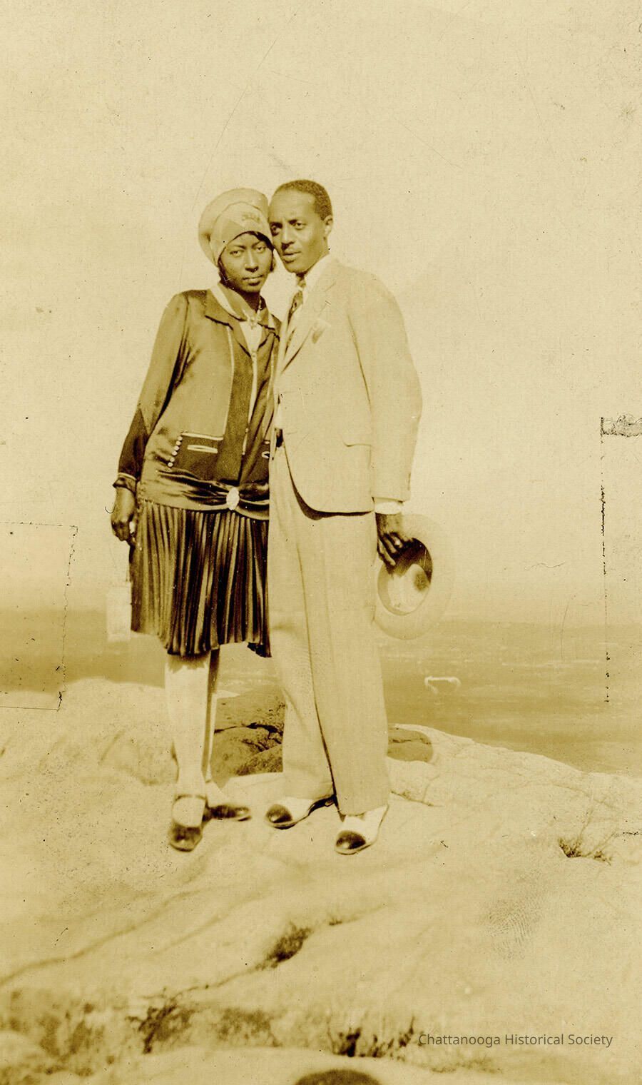 A black and white photograph of a couple at Point Park on Lookout Mountain, Tennessee. The woman is wearing a silk drop waist dress with pleated skirt and a light-colored bonnet. The man is wearing a light colored suit with two tone spectator shoes and holding a hat. The Chattanooga valley and Tennessee River can be seen in the background.