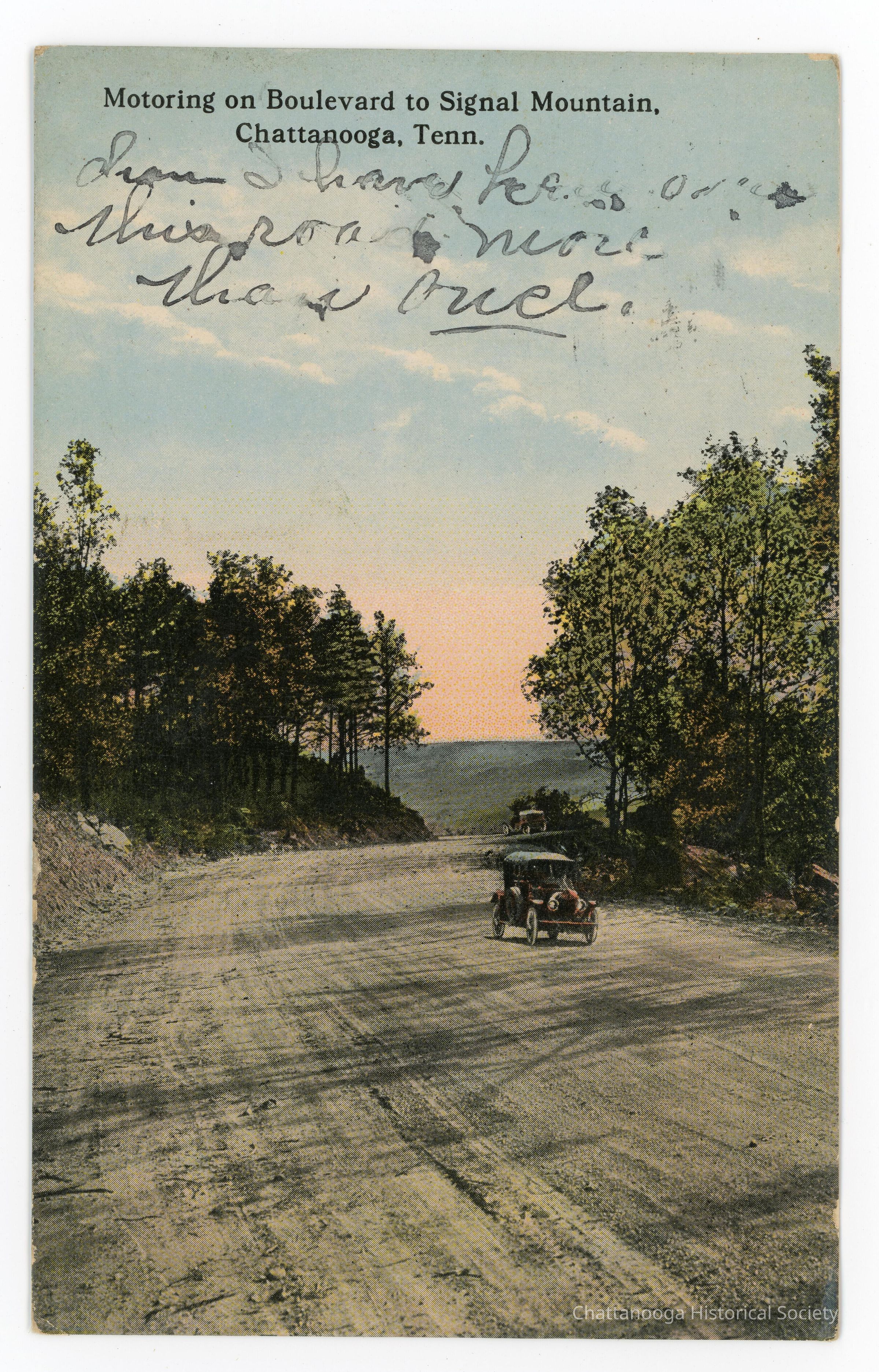 A color tinted postcard featuring a car on the wide, unpaved Signal Mountain Boulevard. The postcard is titled "Motoring on Boulevard to Signal Mountain, Chattanooga, Tenn." and features an early motor car on the way up to Signal Mountain Blvd. with another car appearing to be headed down in the distance. There is writing below the title, in black ink, but it is illegible.