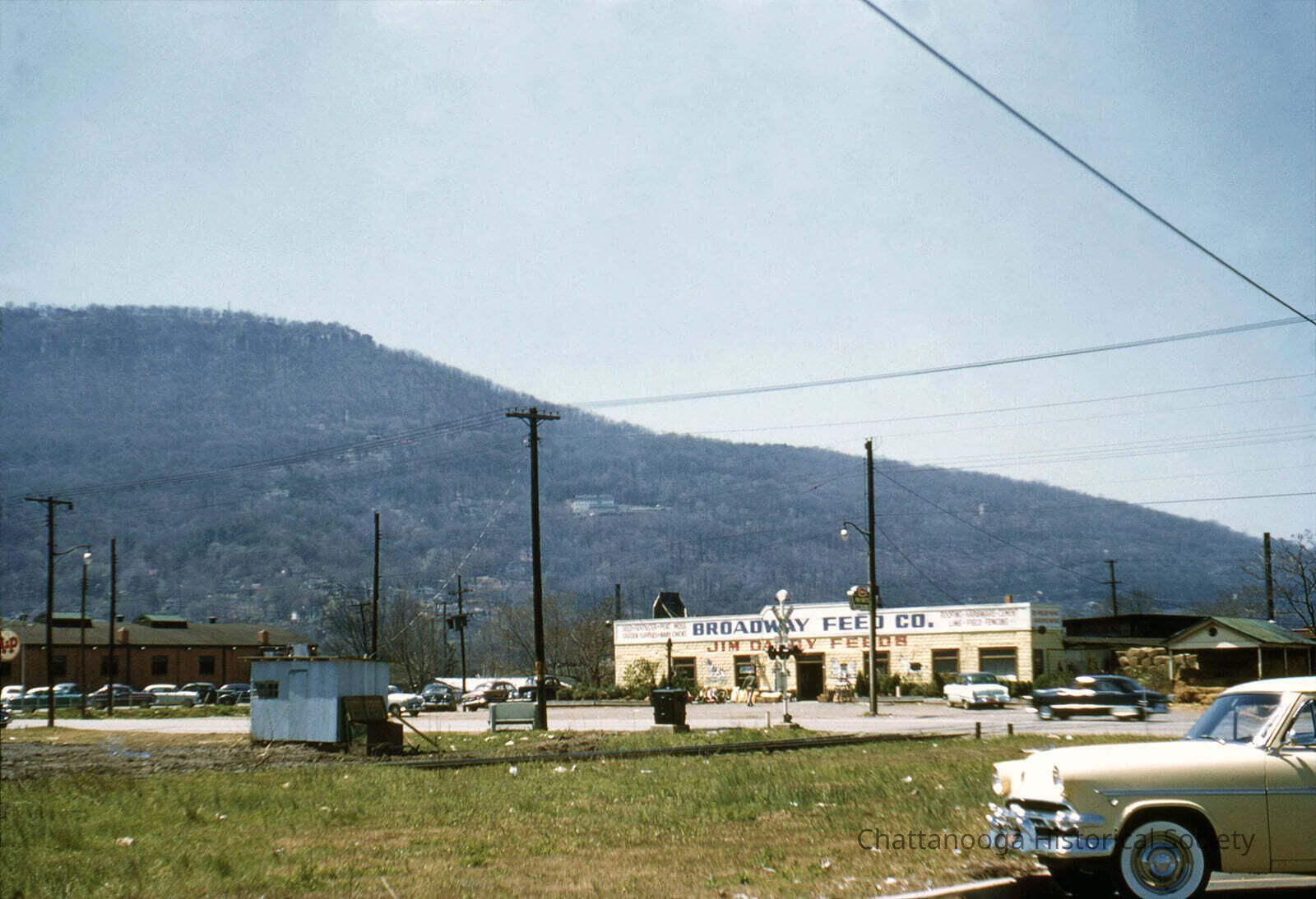 A 35mm Kodachrome Transparency slide of the Broadway Feed Co. at 3147 S. Broad Street, now demolished. The photograph shows the one story, flat roof building with yellow painted stone façade. Black and white murals are painted in between the windows and doors, depicting livestock and dogs. The building has a white fascia which contains a painted sign that reads "Broadway Feed Co." in Navy that is flanked with neon signs advertising their goods (items like baby chick and field fencing) on either side. "Jim Dandy Feeds" is painted in red below the fascia, above the main entrance. The A & P grocery is the brick building at the left edge and Lookout Mountain rises in the background. The PanORam hotel can be seen on the side of Lookout. "Lookout Mt. from Howard Johnsons Apr 1955" is written in pencil on the rear.Photograph Details