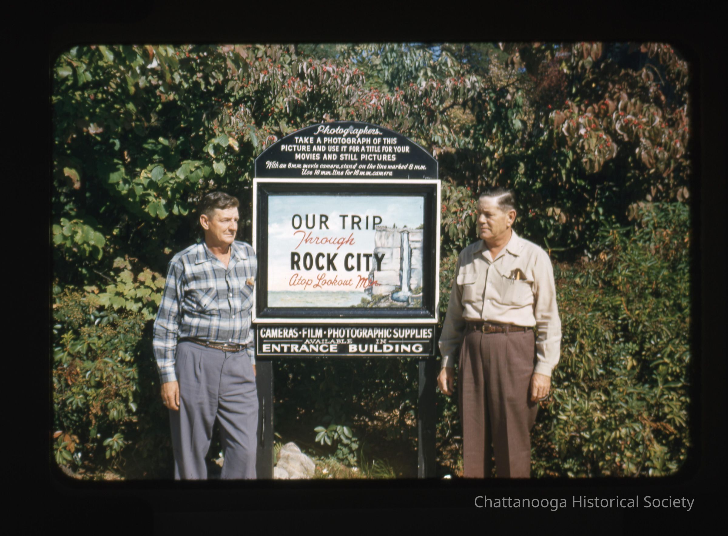 A color negative slide showing two men standing on either side of a Rock City sign. The sign has a large panel at center that reads "Our Trip Through Rock City Atop Lookout Mountain" with a drawing of the High Falls (also called Lovers Leap). There are two black panels at the top and bottom with writing in white. The top portion reads "Photographers, Take a photograph of this picture and use it for a title for your Movies and Still Pictures. With an 8mm movie camera, stand on the line marked 8m.m. Use 16m.m. line for the 16m.m. camera". The bottom panel reads "Camera . Film . Photographic Supplies -Available in -Entrance Building".