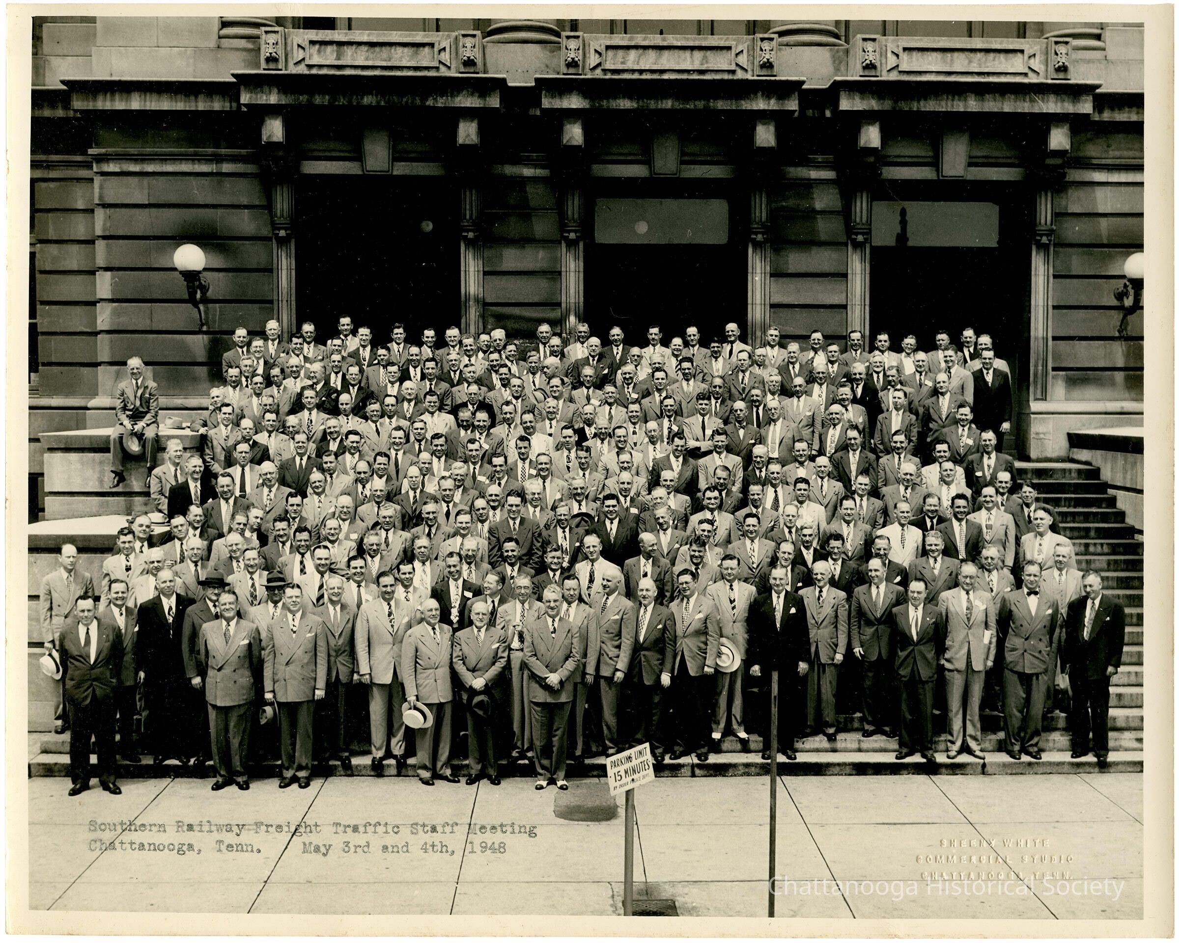 A photograph of the attendees of the Southern Railway Freight Traffic Staff Meeting, taken in front of City Hall.Photograph Details
