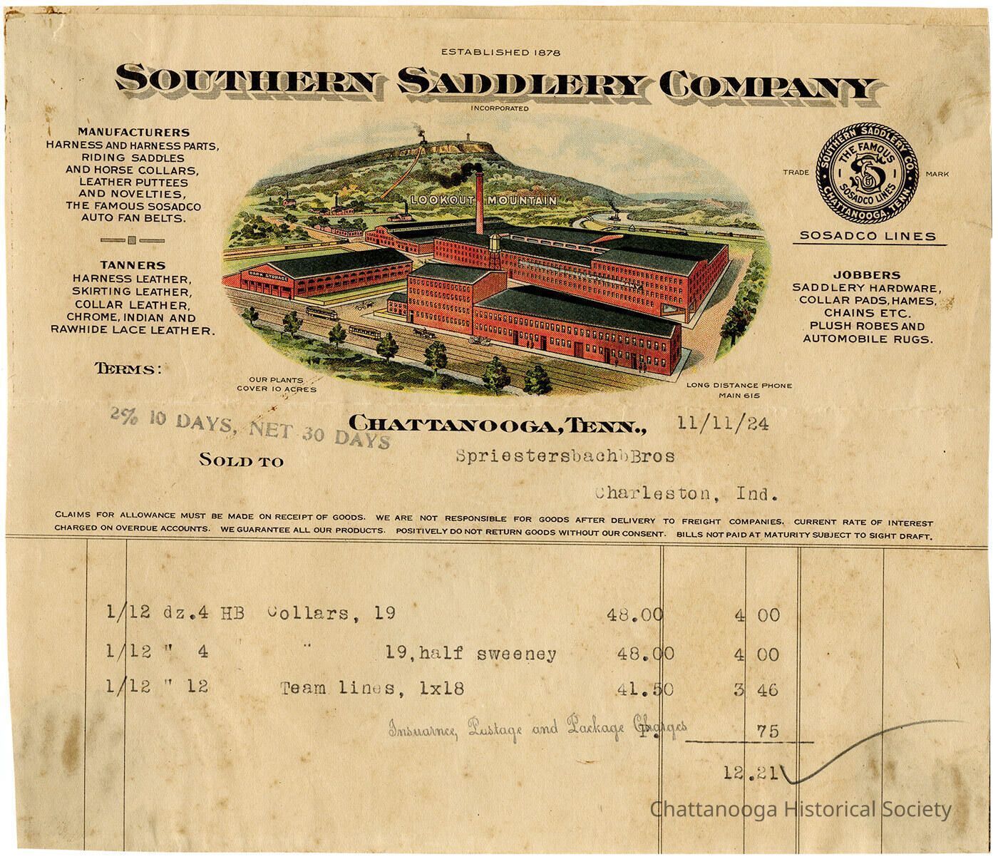 A receipt from the Southern Saddlery Company of Chattanooga a color illustration of its manufacturing facility with Lookout Mountain in the distance.