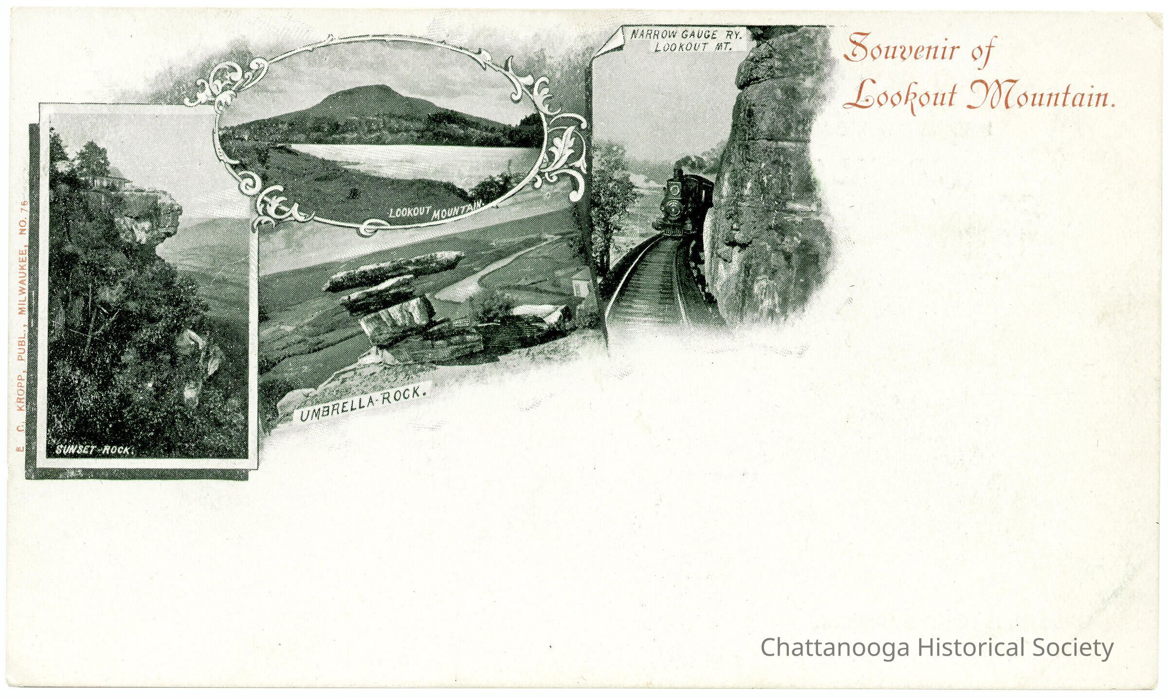 A private mailing card with the front showing an illustration of four views of Lookout Mountain, with Sunset Rock, Lookout Mountain, The Narrow Gauge Railway, and Umbrella Rock.